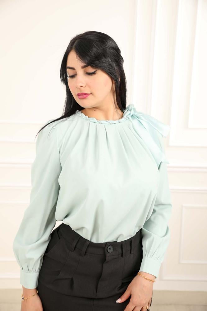 بلوزة أنيقة ومميزة مصممة بأزرار أمامية، مزينة باللؤلؤ على الياقة وربطة أنيقة عند العنق. مثالية لإطلالة راقية في مختلف المناسبات.