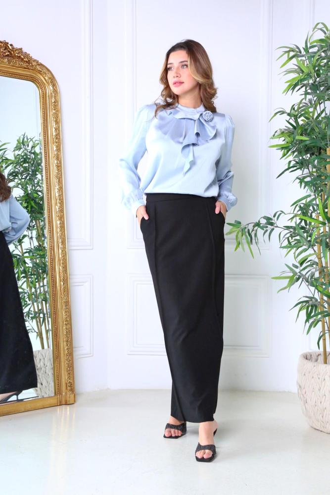 إطلالة راقية ببلوزة سماوي بوردة وتنورة سوداء طويلة