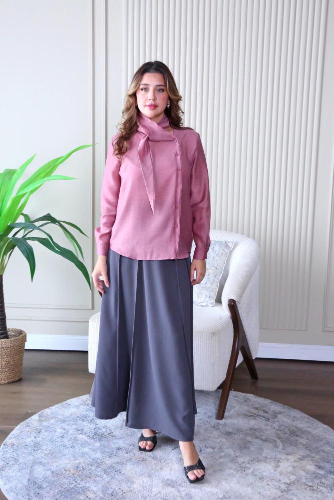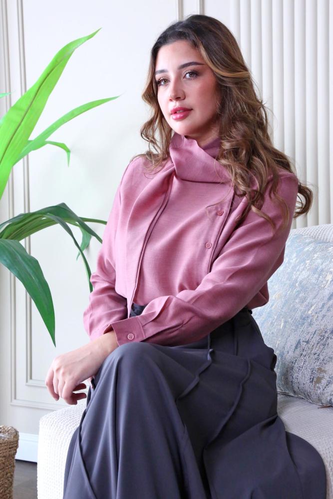 بلوزة أنيقة بلون زهري، مصنوعة من قماش الكتان الناعم، تتميز بقصة فريدة في العنق على شكل فيونكة وإسكارف.