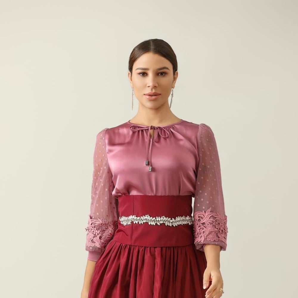 بلوزة كريب حرير بلمعة فاخرة وأكمام دانتيل منقّطة، لإطلالة أنثوية جذابة.