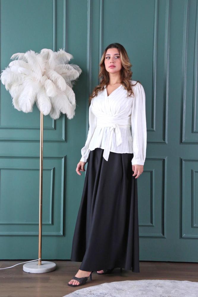 تنورة أنيقة مصنوعة من قماش ستان حرير باللون الأسود، مثالية لإطلالة عصرية وأنيقة تناسب جميع المناسبات.