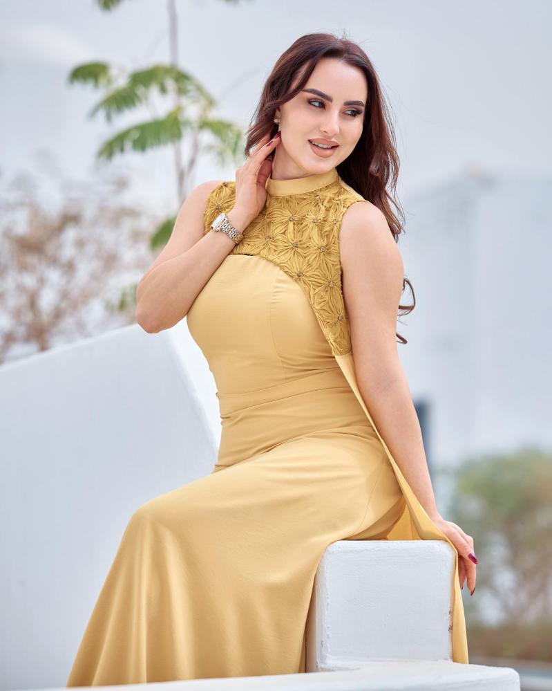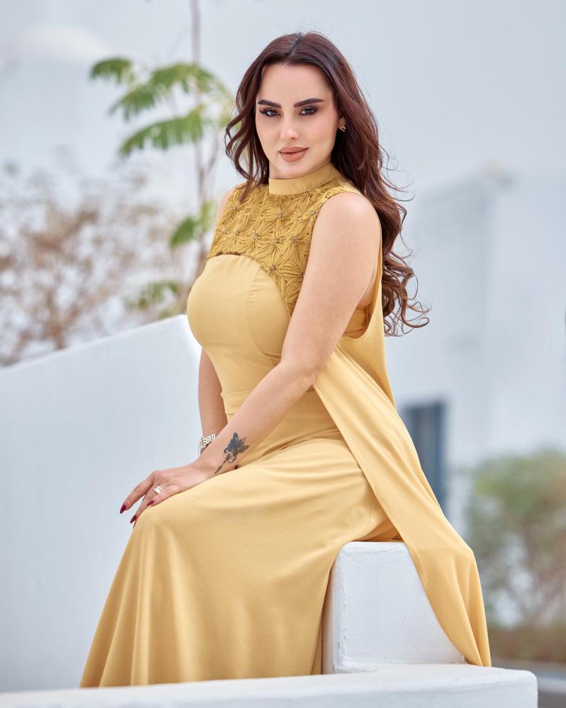 يأتي الجزء العلوي مطرزًا يدويًا بكريستال سواروفسكي مع نقشة ورد راقية تضيف بريقًا فاخرًا يلفت الأنظار دون مبالغة، بينما يوفّر التبطين الداخلي راحة مثالية واحتشامًا أنيقًا.