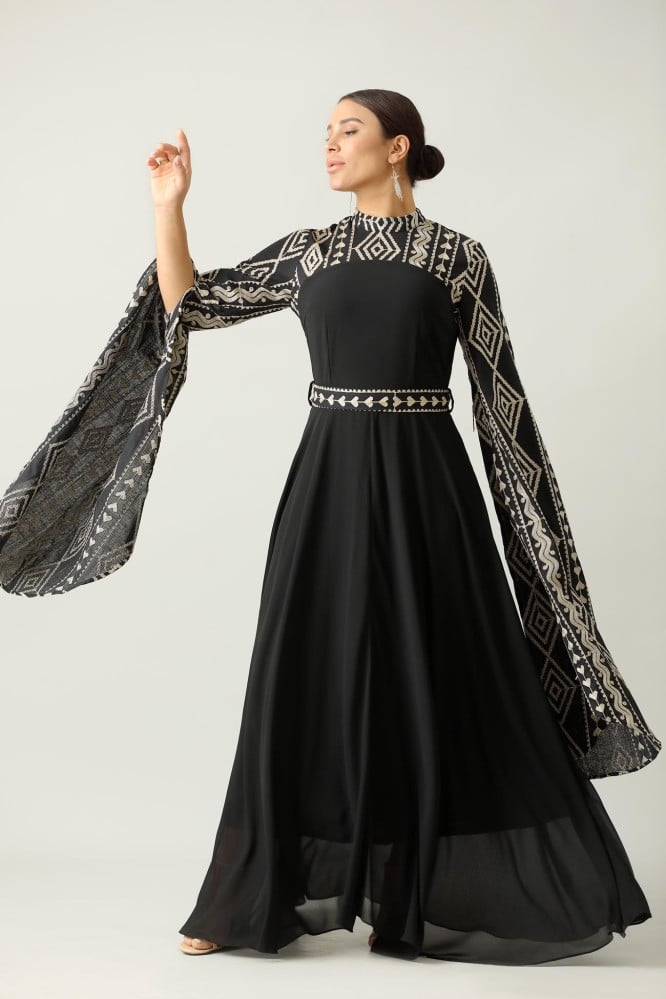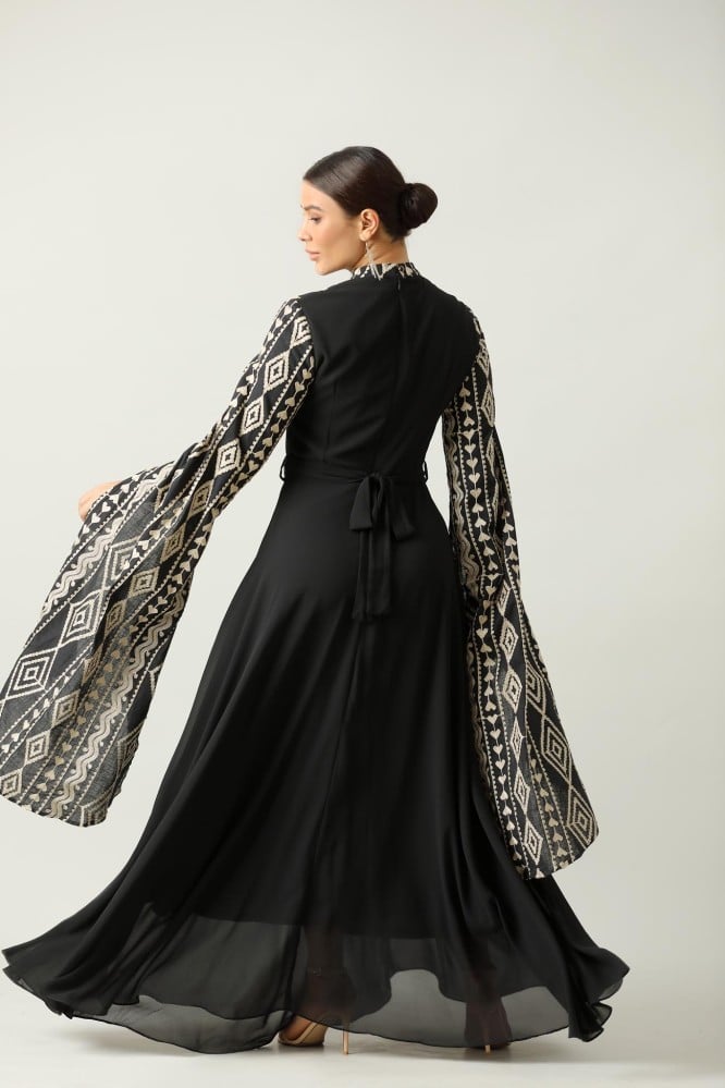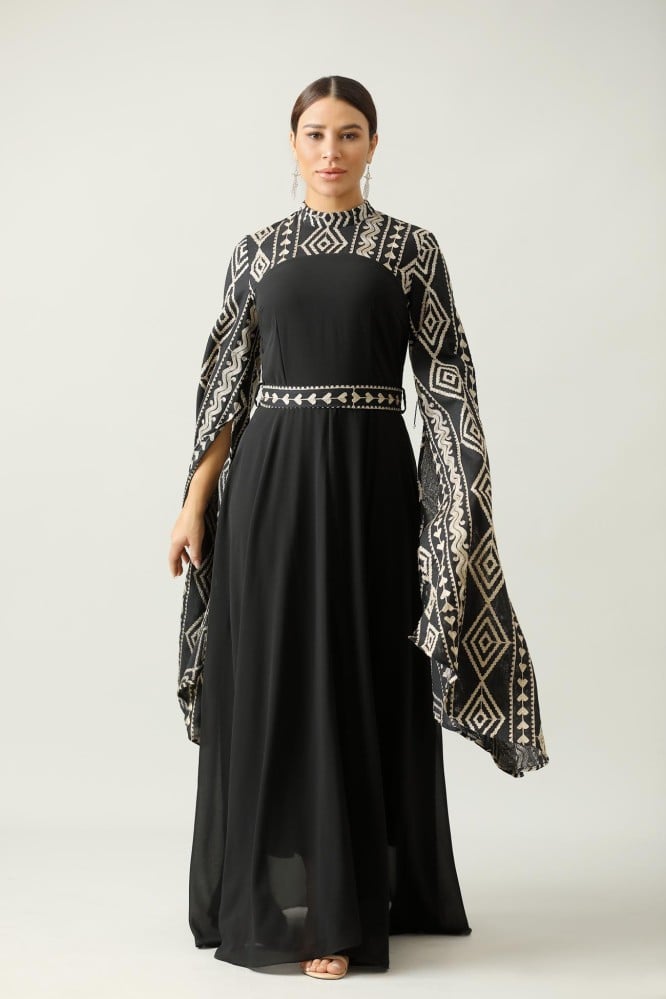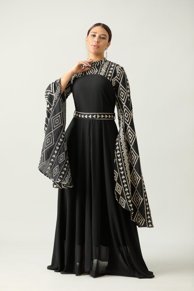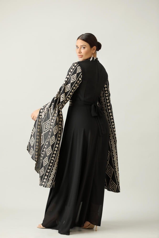 جلابية اسود طويله اكمام طويل نقشة على الصدر والاكمام