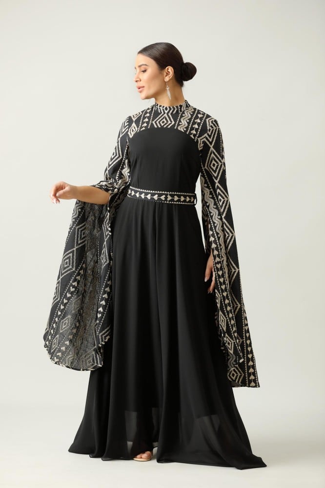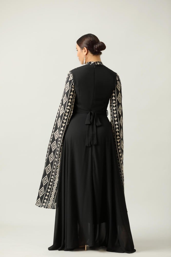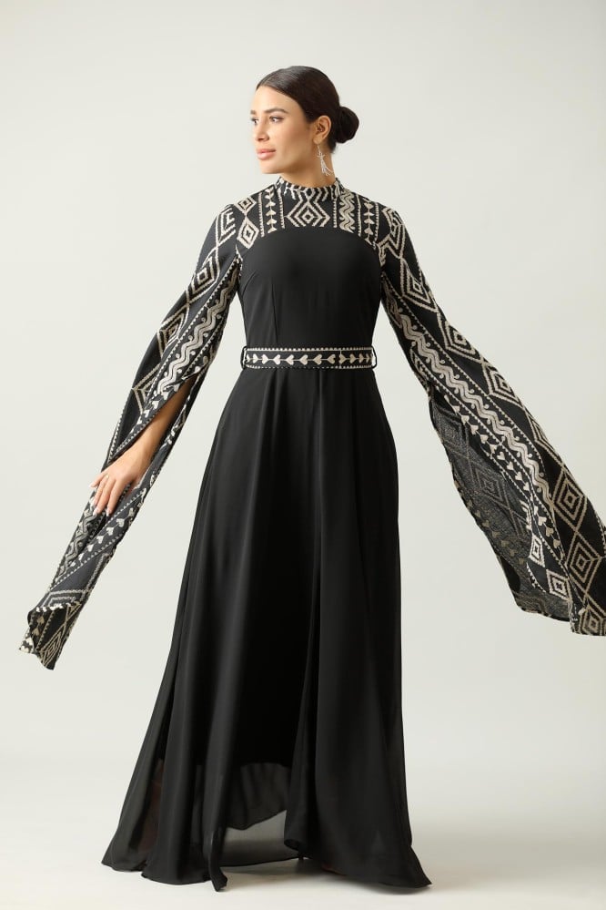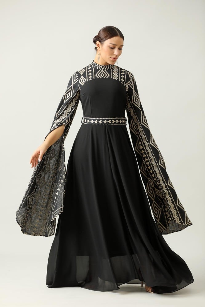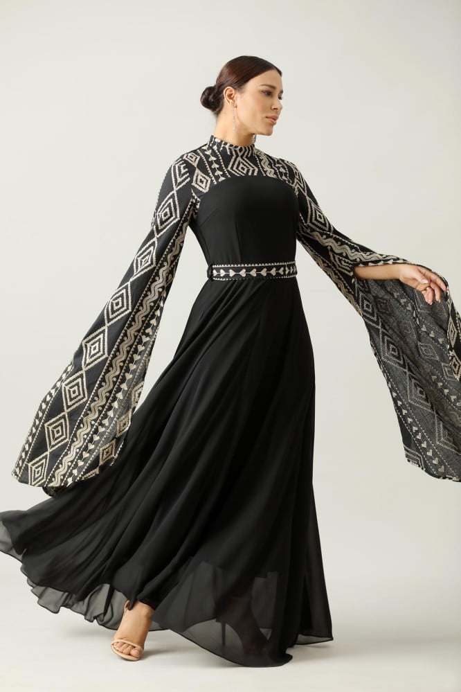 جلابية اسود طويله اكمام طويل نقشة على الصدر والاكمام
