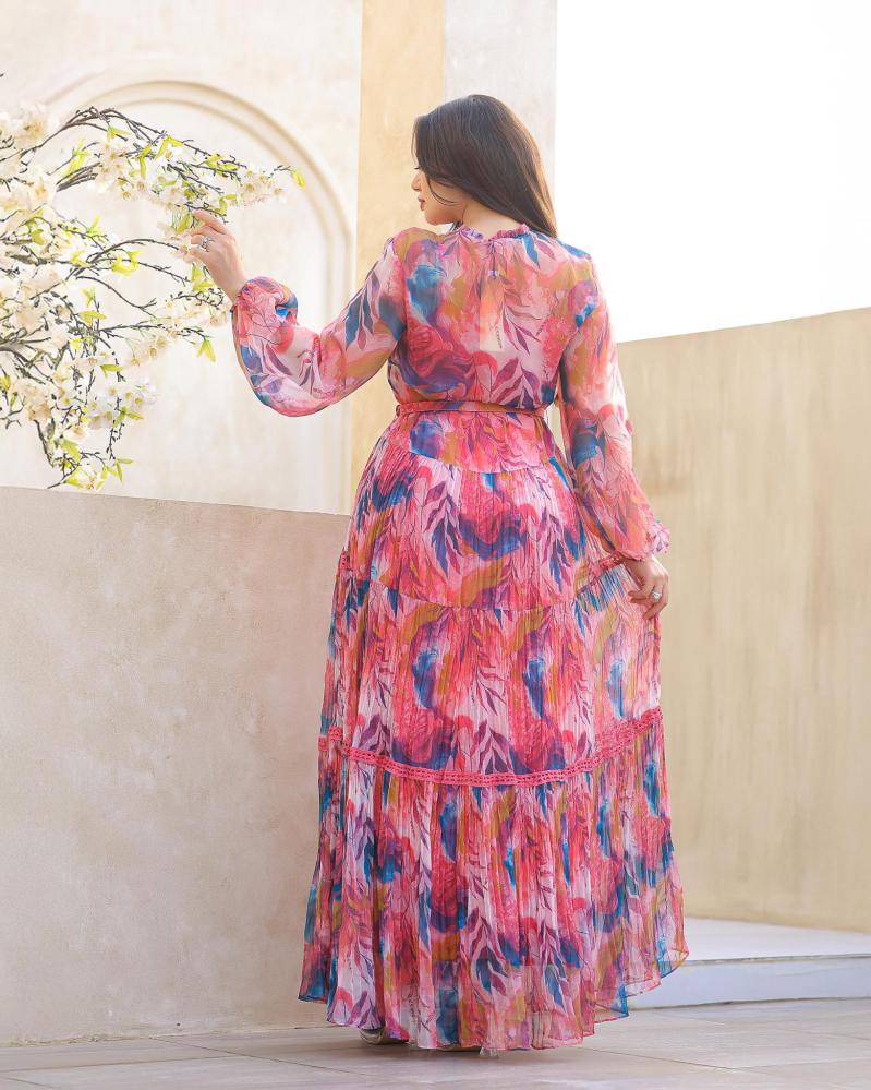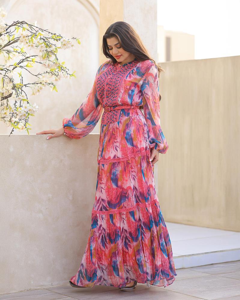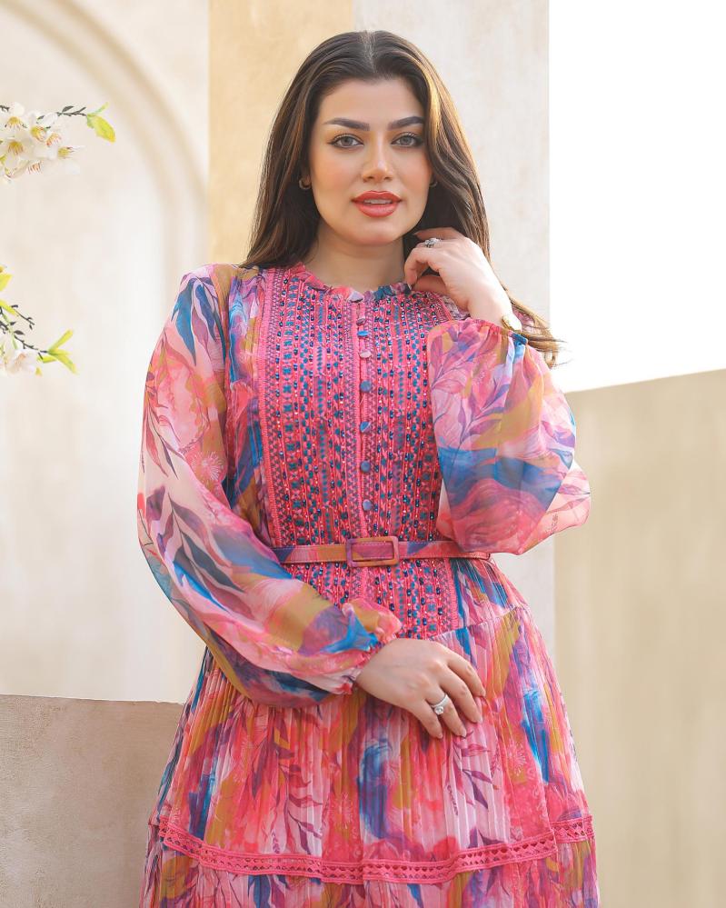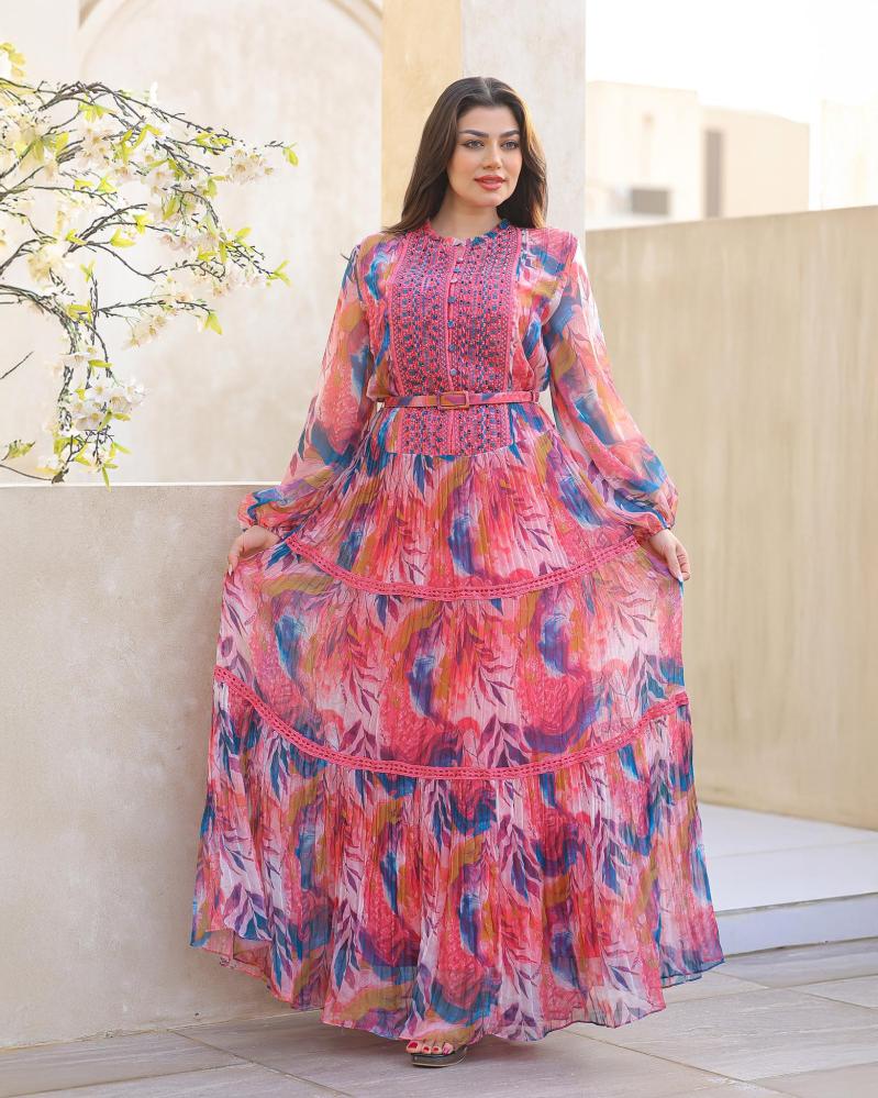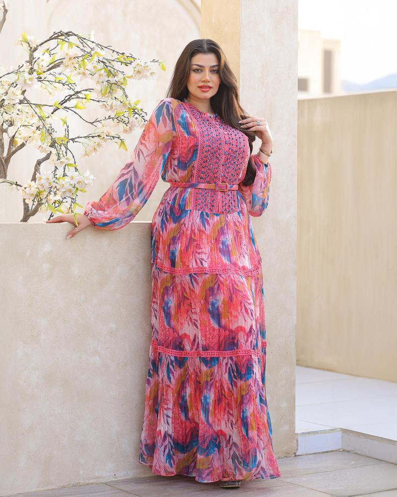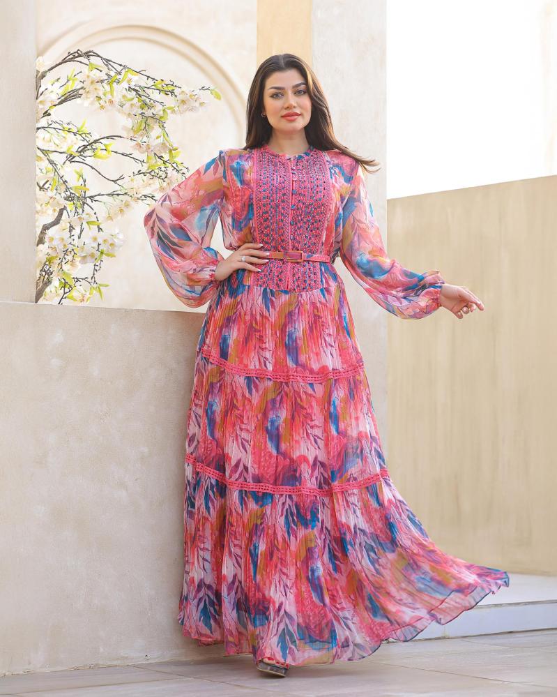 جلابية شيفون مشجرة فاخرة مع شك كريستال بالصدر وحزام أنيق