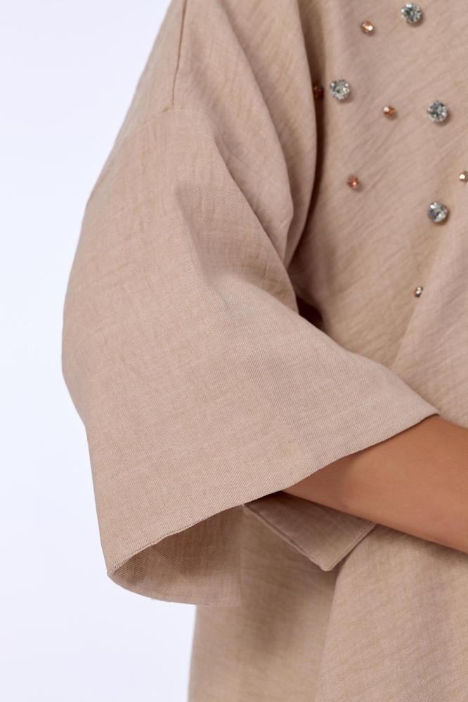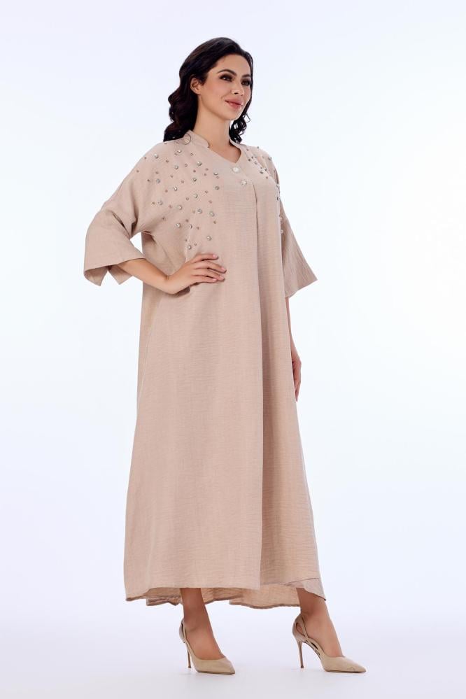 جلابية أنيقة بقصة فضفاضة مريحة، من قماش الكريب بلون لحمي ناعم، مزينة بكريستالات تضيف لمعة ناعمة تليق بالمناسبات.