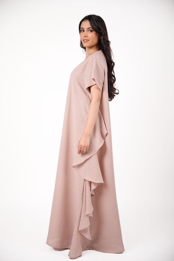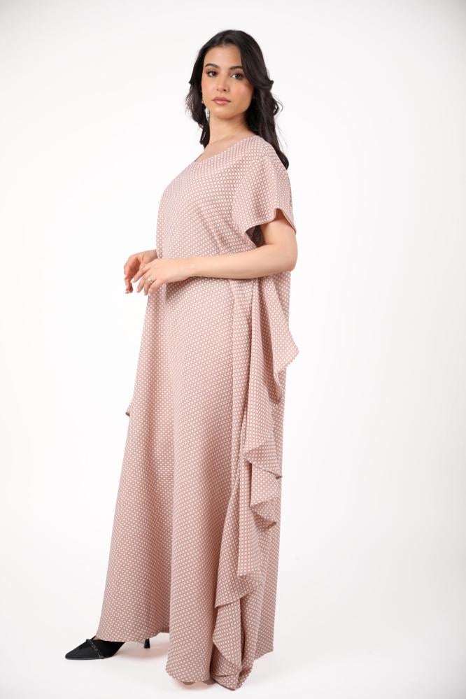 جلابية كويتي أنيقة بلون لحمي ناعم، تتميز بتصميم منقط مع درابية جذابة على الجوانب.