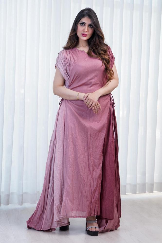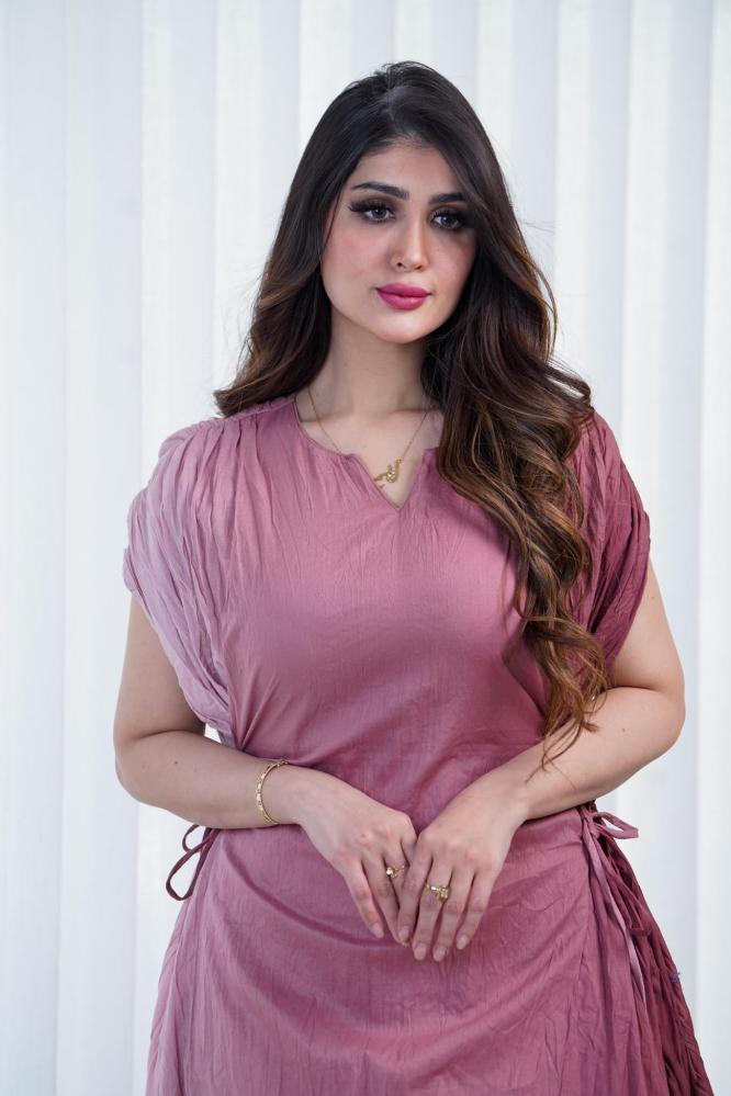 جلابية كويتية بتصميم واسع مريح بلون لحمي مموج، مصنوعة من قماش مكسر خفيف، مع ربطة أنيقة على الخصر تمنحك إطلالة أنثوية راقية.