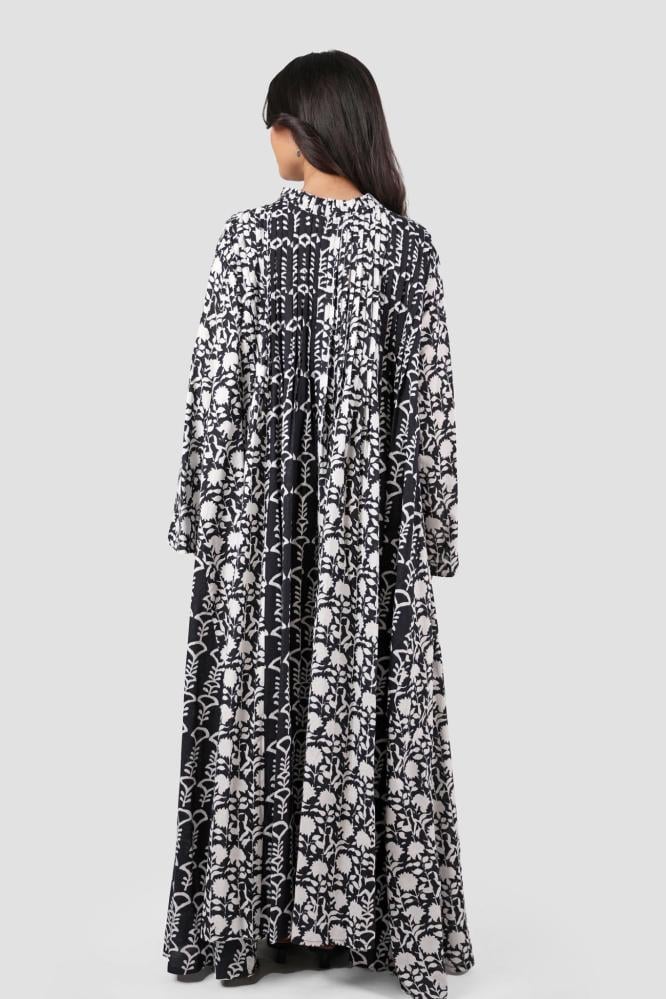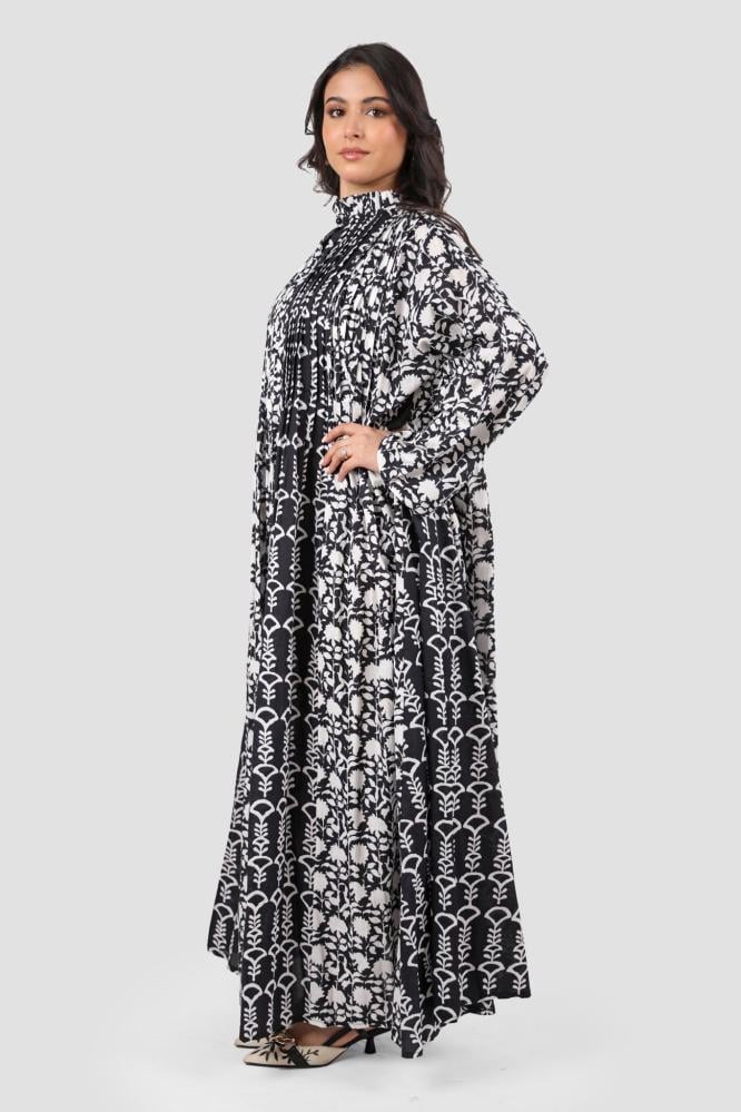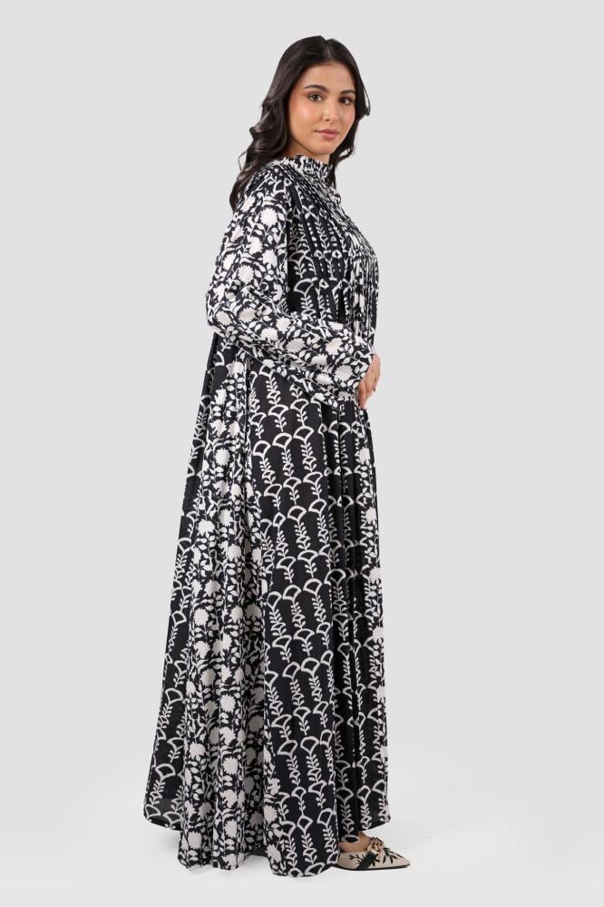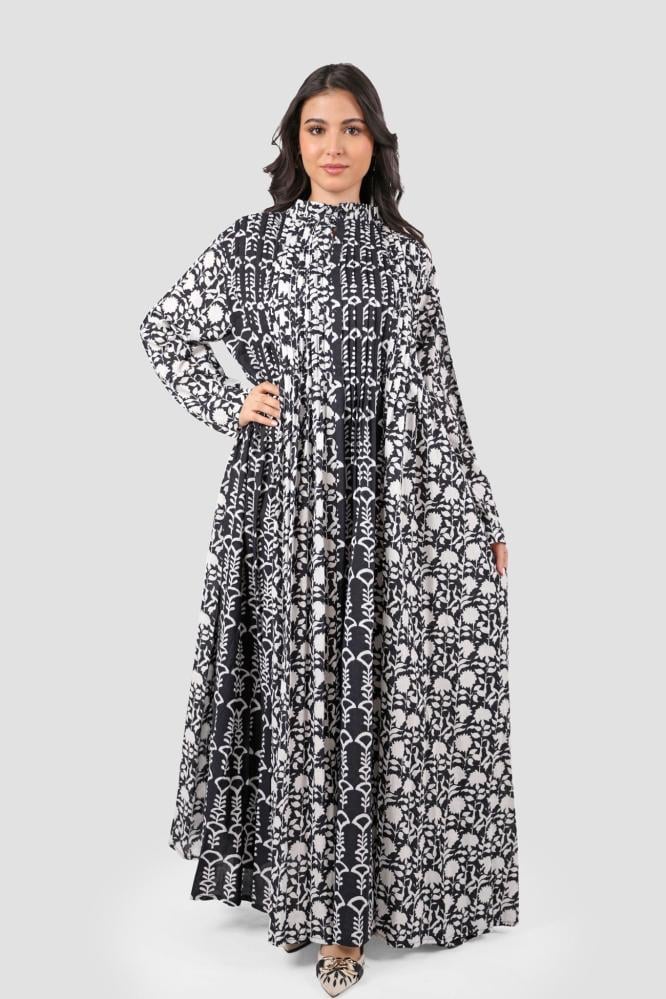 جلابية أنيقة باللونين الأسود والأبيض، مزينة بنقشات مشجرة وأكمام طويلة لإطلالة مميزة ومريحة.