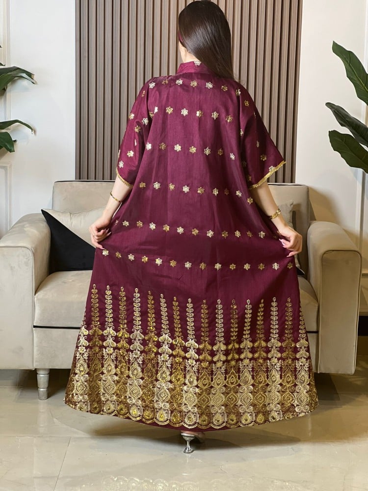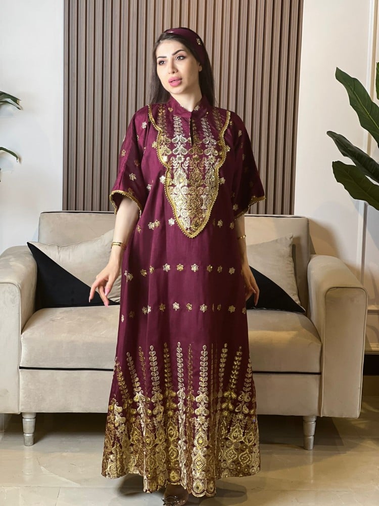 تألقي بإطلالة فاخرة مع هذه الجلابية الكويتي المصممة خصيصاً للسهرات والمناسبات المميزة. تتميز بقماش تفتة لامع وواسع يمنحك الراحة، مع تفاصيل تطريز يدوي دقيق يغطي الأكمام والحواف ليضفي لمسة من الأناقة والجمال. تتوفر بألوان غنية تناسب جميع الأذواق: العنابي الفخم والرمادي الراقي.