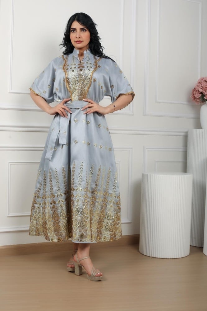 جلابية كويتي واسعة من قماش التفتة اللامع، مزينة بتطريز يدوي فاخر مع حواف أكمام مطرزة تضفي لمسة ساحرة. متوفرة بلونين أنيقين: عنابي ورمادي.