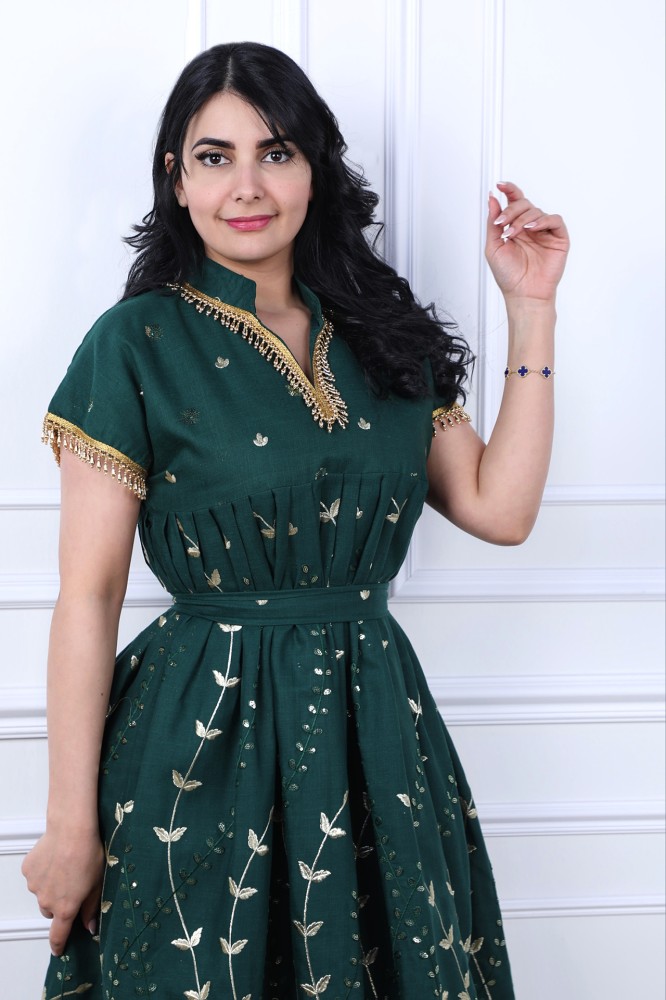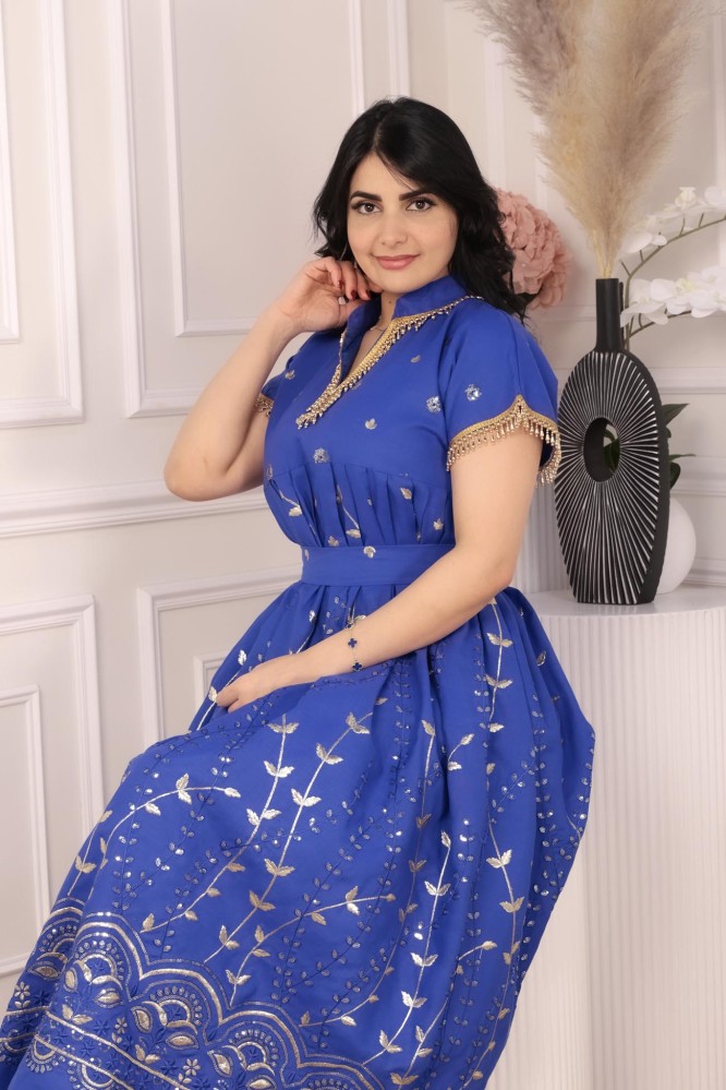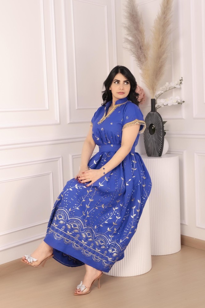 تألقي بجلابية ميدي مميزة بتصميم راقٍ مع تطريز مائي بلون متناغم ورسومات جذابة، مثالية للسهرات والمناسبات.