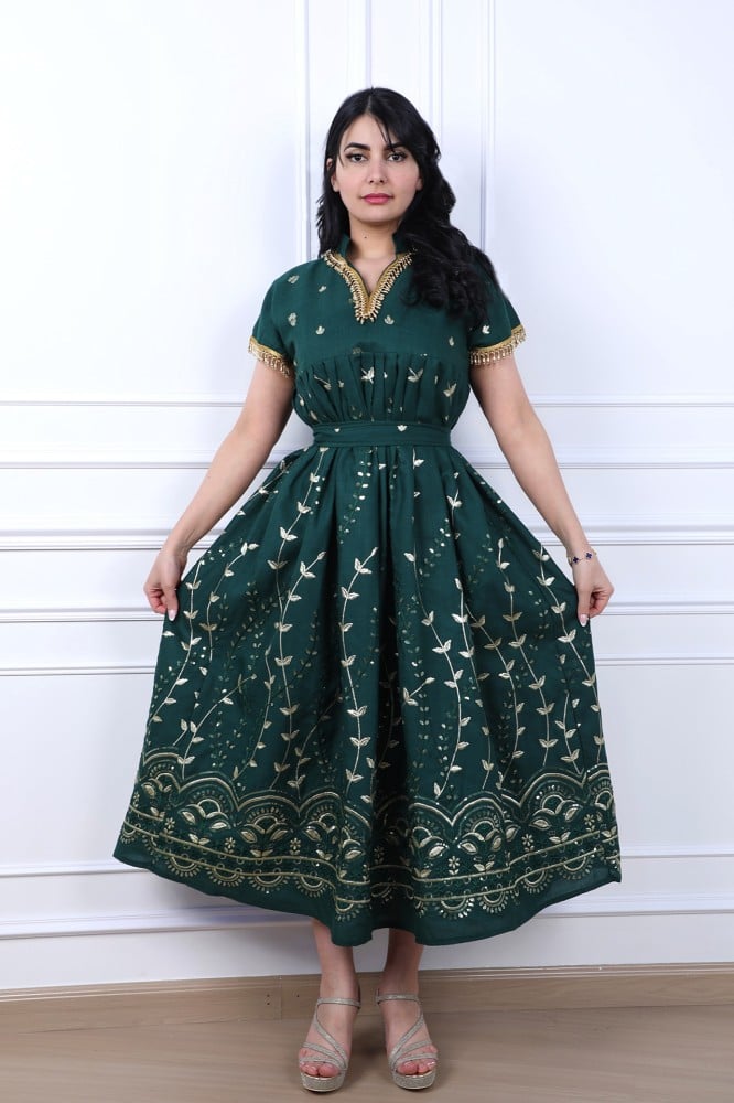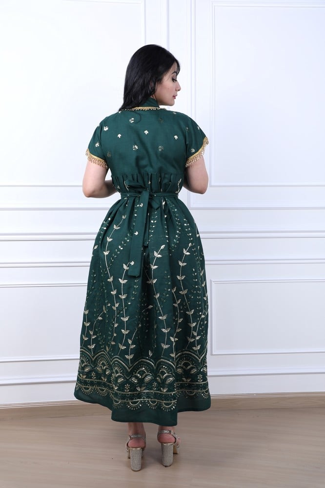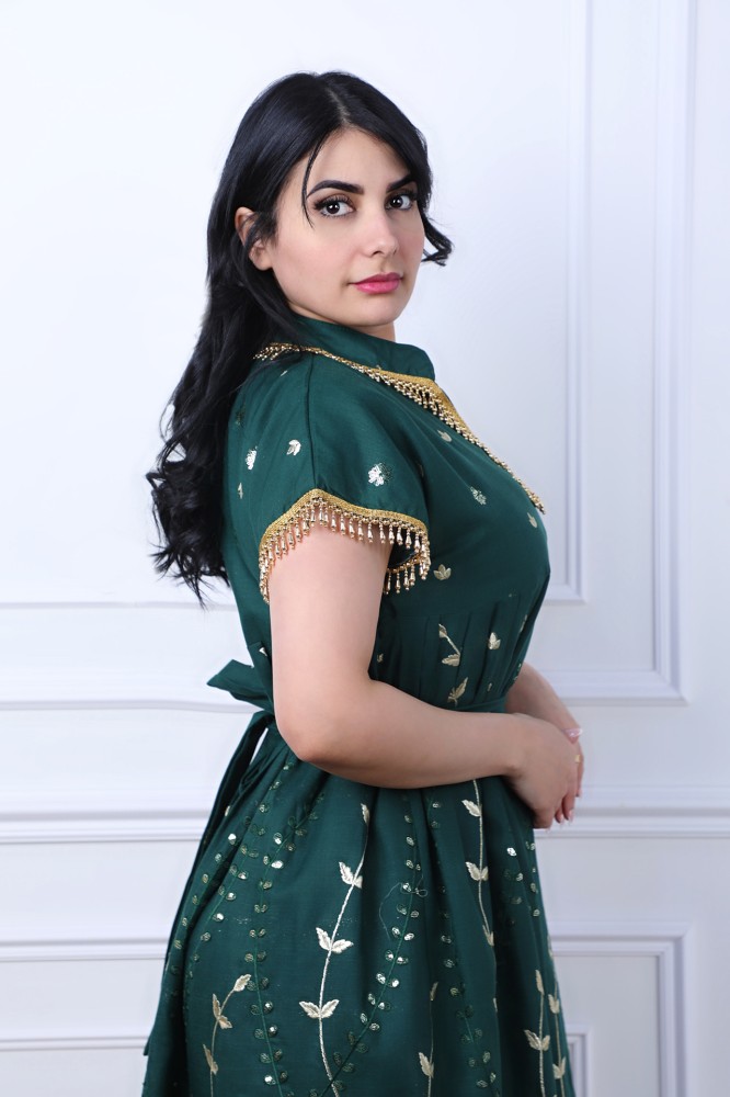 تمتعي بإطلالة أنيقة مع هذه الجلابية الميدي المصممة بعناية لتناسب السهرات والمناسبات. يتميز التصميم برسومات فنية أنيقة مزينة بتطريز مائي بنفس درجة اللون لإضفاء لمسة من الفخامة.