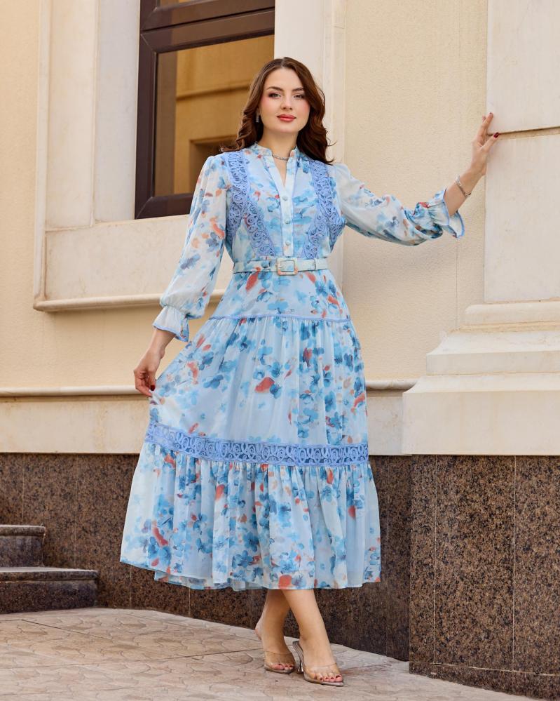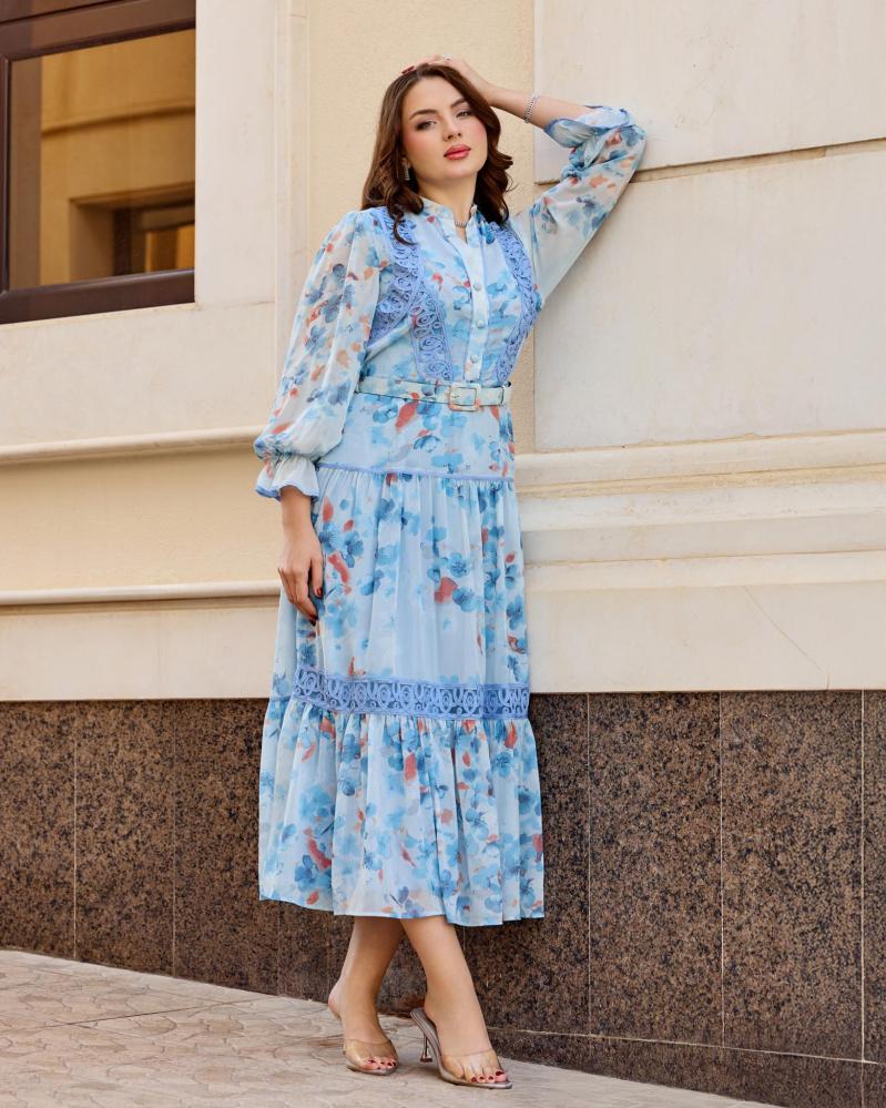 جلابيه شيفون  مشجر بقصة أنثوية وحزام أنيق
