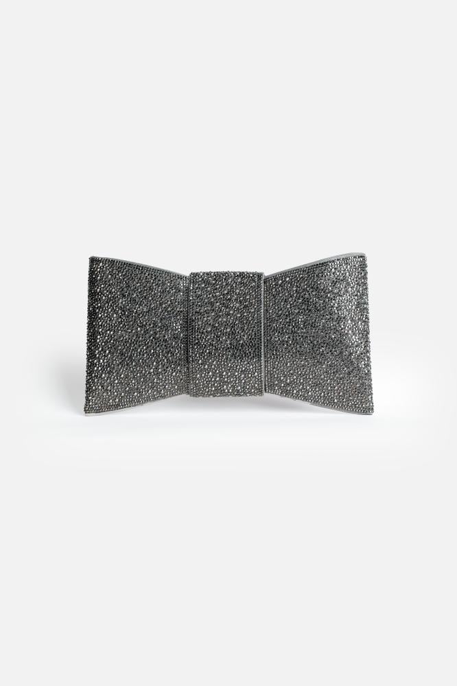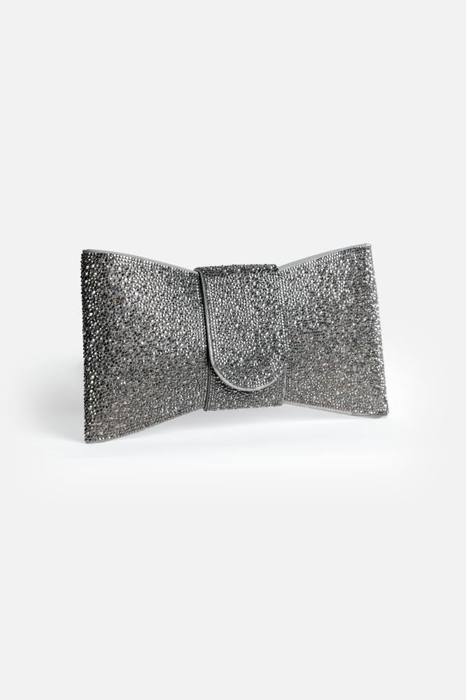 شنطة سهرة بتصميم فيونكة مرصعة بزركون لون رصاصي