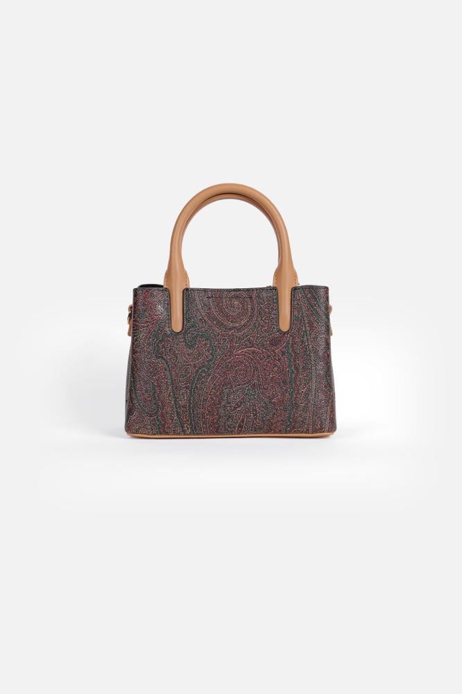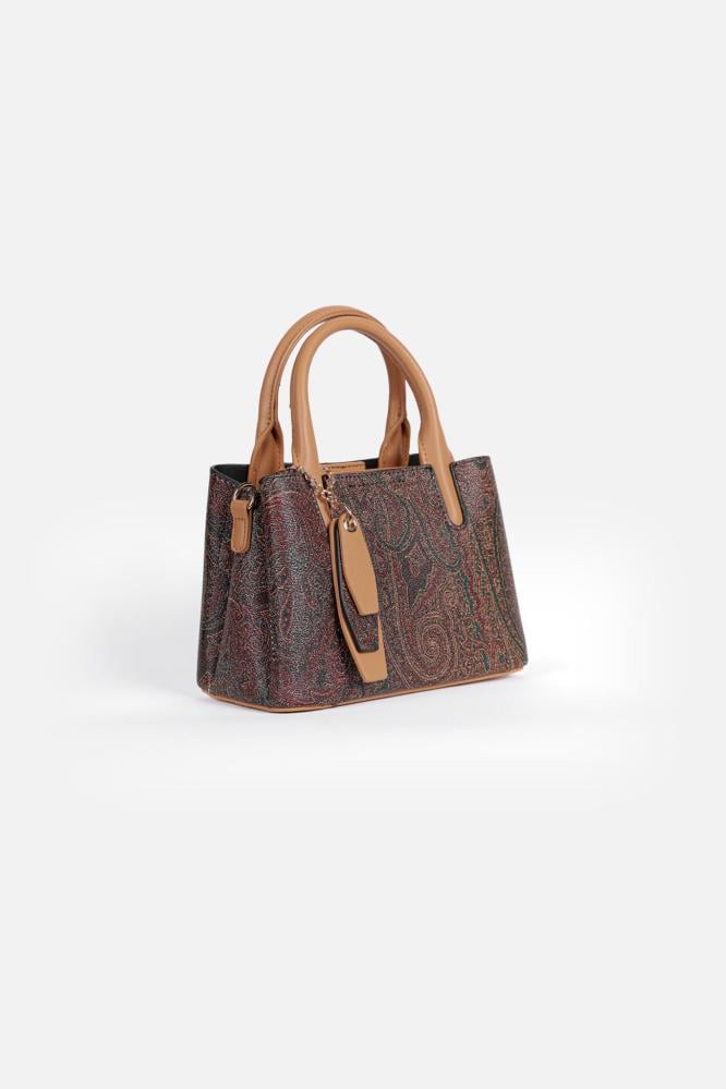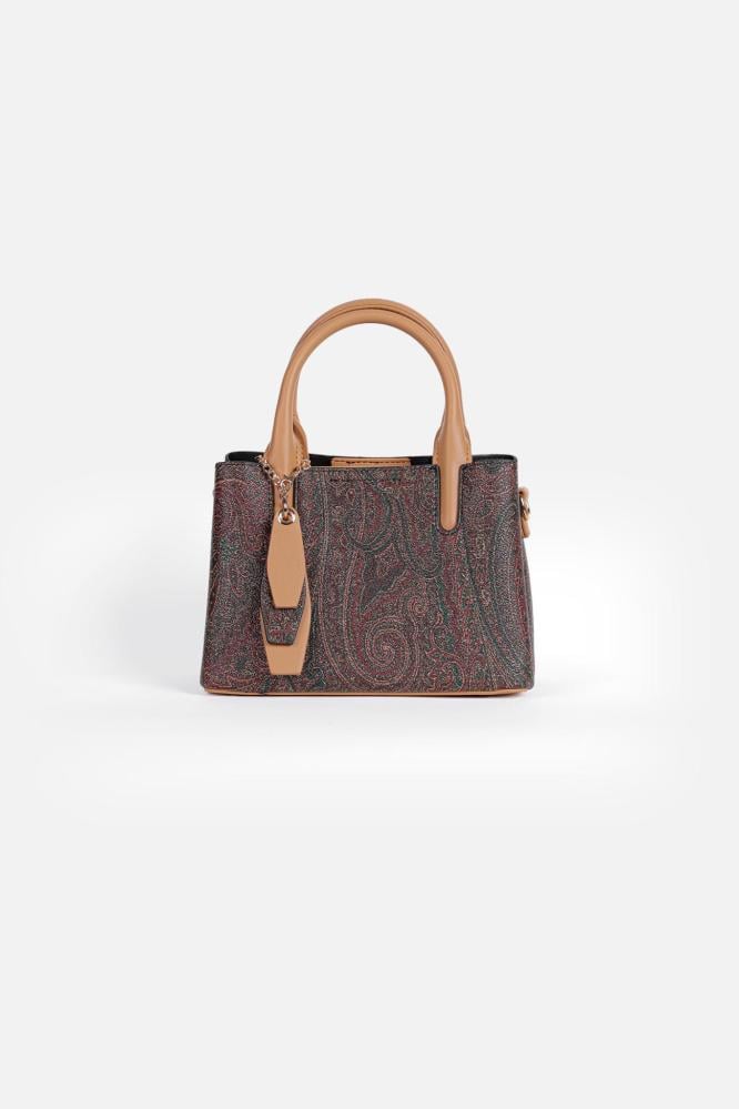 شنطة أنيقة من ماركة باجكو (Bagco) بتصميم مستوحى من النقش الشرقي الكلاسيكي، تأتي بتفاصيل جلدية بيج فاتح تمنحها لمسة ناعمة وفاخرة.