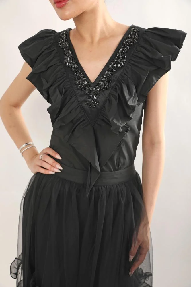 ارتقي بإطلالتك مع هذا الطقم الأسود الراقي الذي يجمع بين الفخامة والأنوثة في كل تفصيلة. تأتي البلوزة بقصة ضيّقة بدون أكمام، مزينة بكشاكش بارزة حول الرقبة وتطريز يدوي لامع، بينما تنسدل التنورة بطبقات التول الشفافة المزينة بورود ثلاثية الأبعاد مطرزة بالترتر الناعم. تصميم متوسط الطول يبرز أناقتك بلمسة ساحرة، مثالي للمناسبات الخاصة والسهرات.