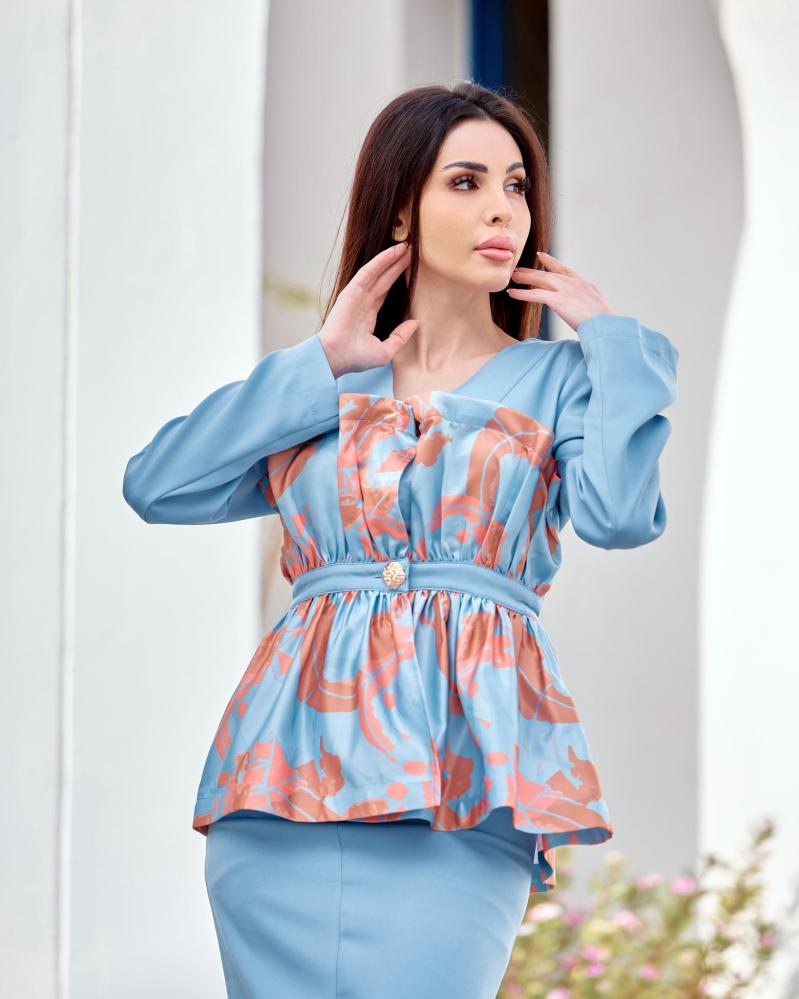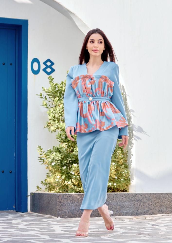 طقم أنثوي بتصميم عصري يجمع بين البساطة الراقية والتفاصيل اللافتة في الجزء العلوي، ليمنح إطلالة متوازنة تجمع بين الأناقة والنعومة.
