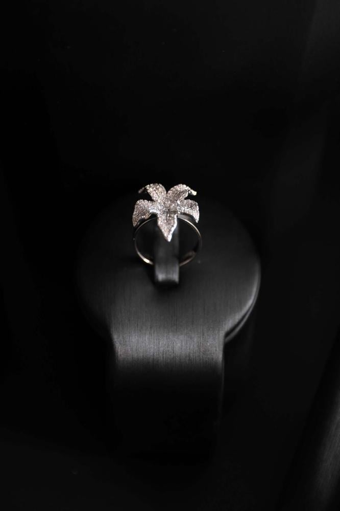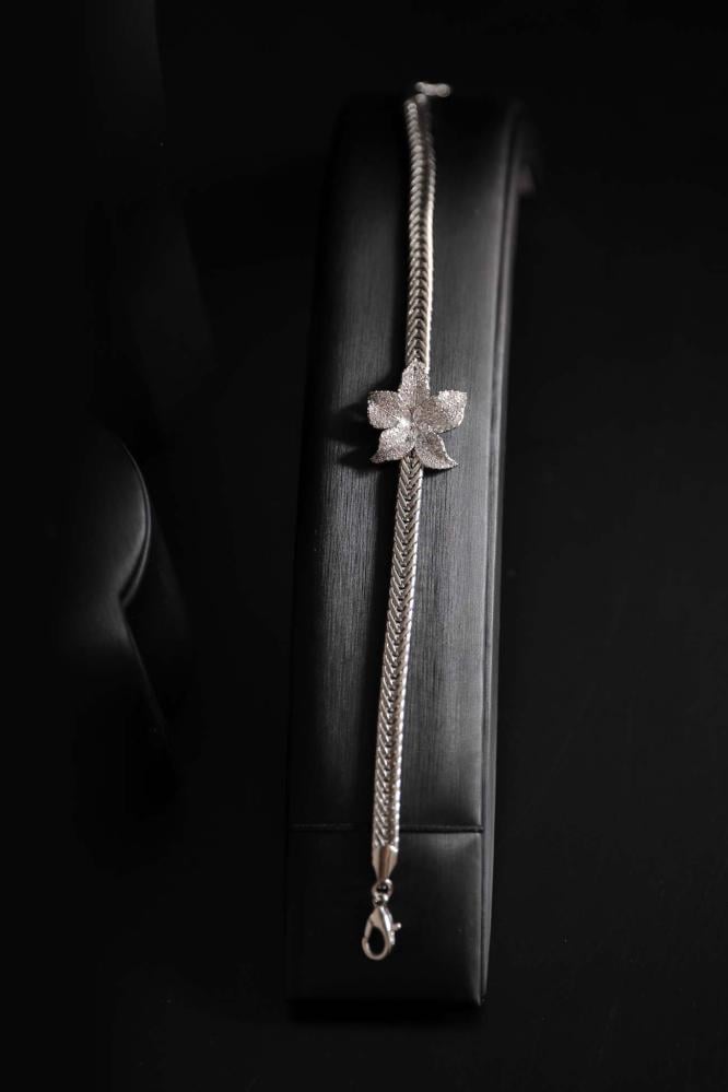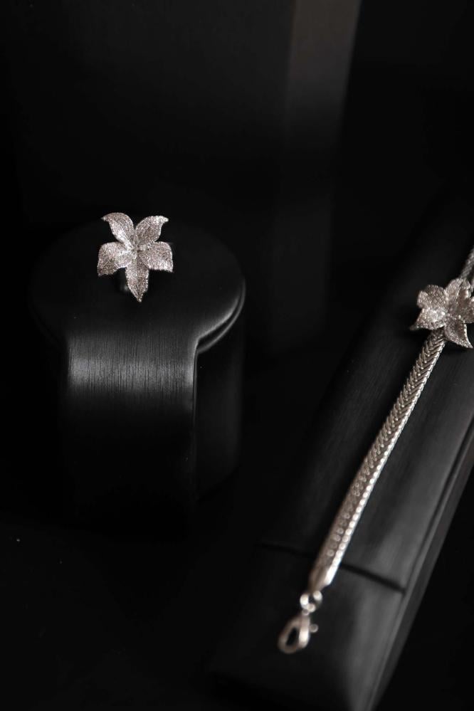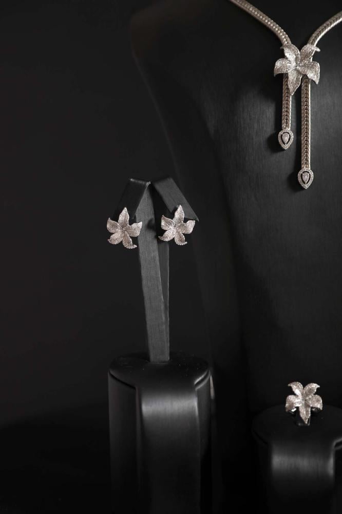 اختاري التألق بأسلوب فريد مع هذا الطقم الفضي الفاخر المصمم بوردة مركزية ناعمة تمنحكِ لمسة من الرقي والأنوثة.