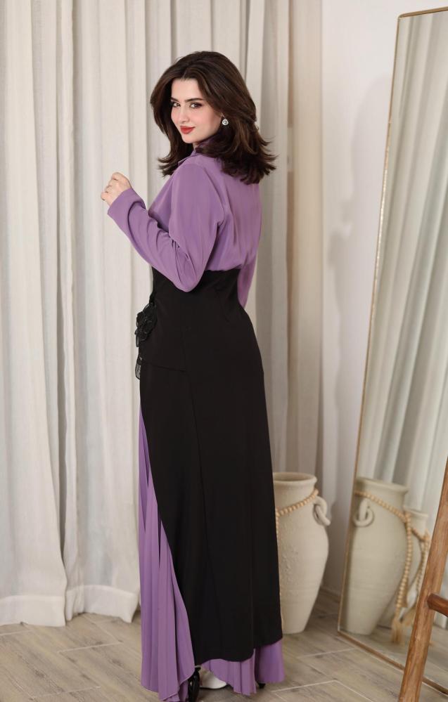 تألقي بإطلالة فريدة وأنيقة مع هذا الطقم المميز الذي يجمع بين الفخامة والراحة. يتكون الطقم من بلوزة على شكل فستان باللون البنفسجي الرائع، مصنوعة من قماش كريب ستان الناعم والفخم، لتمنحك مظهراً مفعماً بالأنوثة والجاذبية. تأتي البلوزة مع تفاصيل سوداء أنيقة مصنوعة من قماش الكريب، تضفي لمسة من الفخامة والرقي.