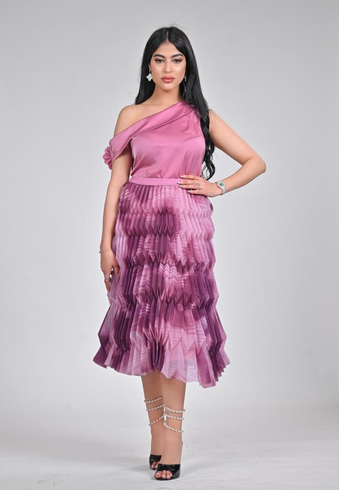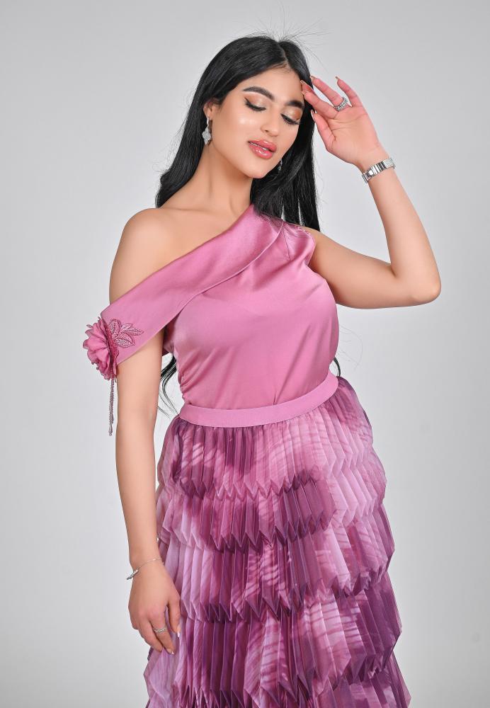 طقم نسائي أنيق بلون زهري، يضم بلوزة كريب ساتان بكتف واحد مزينة بوردة، مع تنورة شيفون مشجر بتصميم كسرات عصري وأنيق، مثالي للمناسبات الخاصة والحفلات.