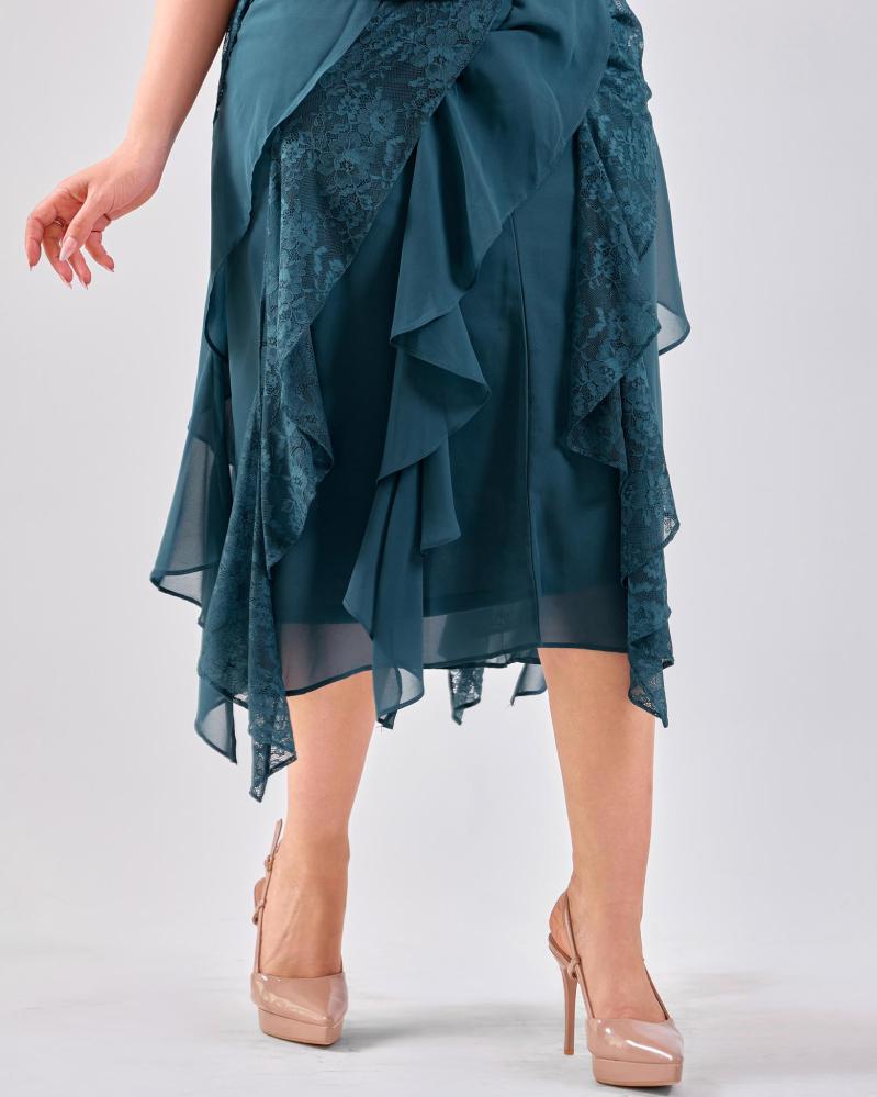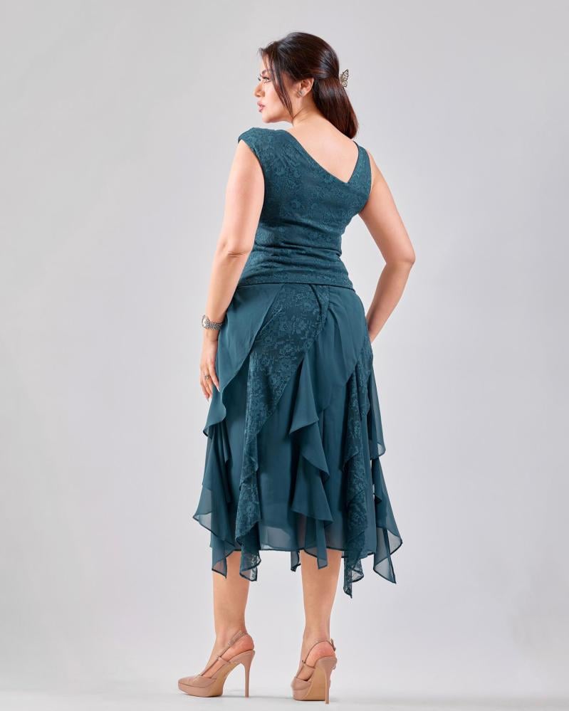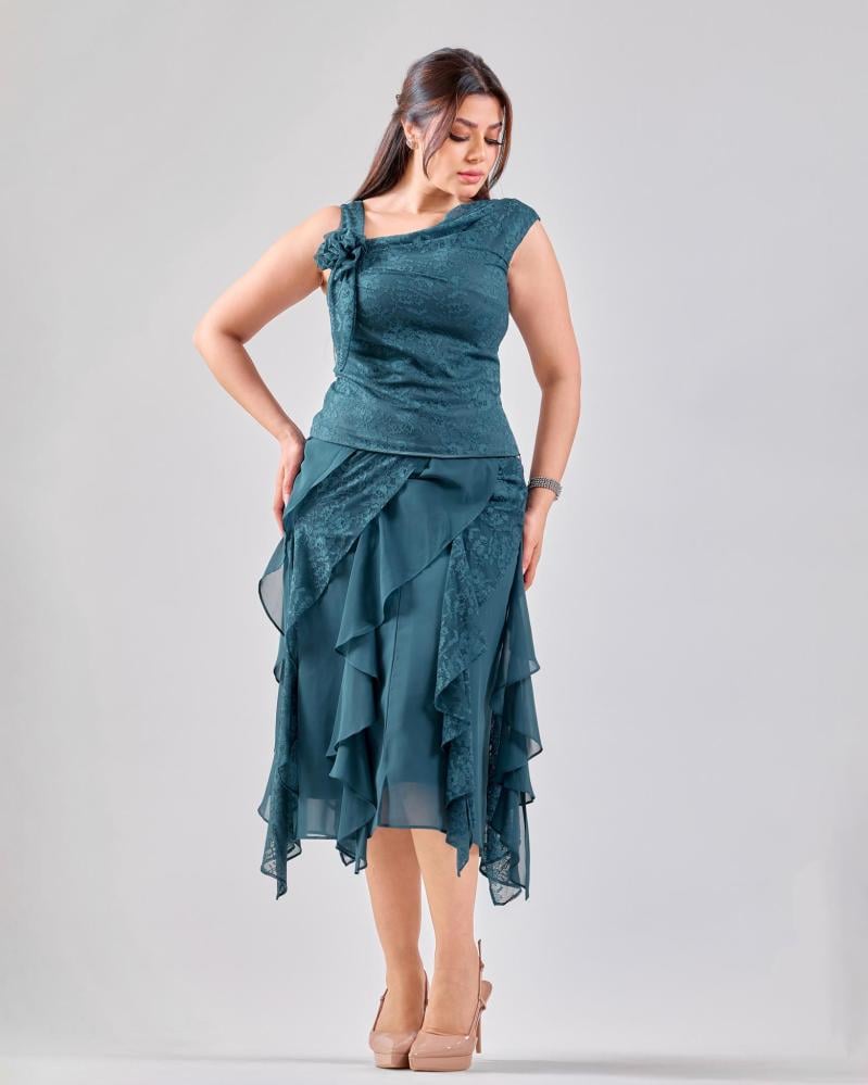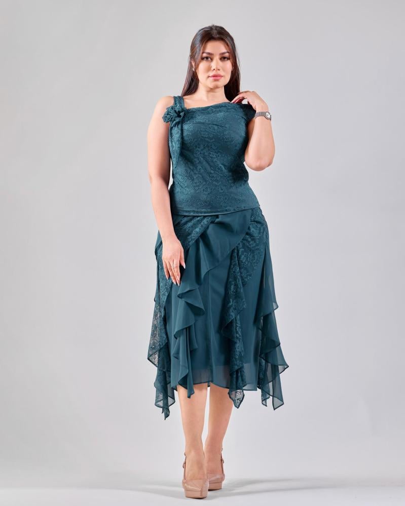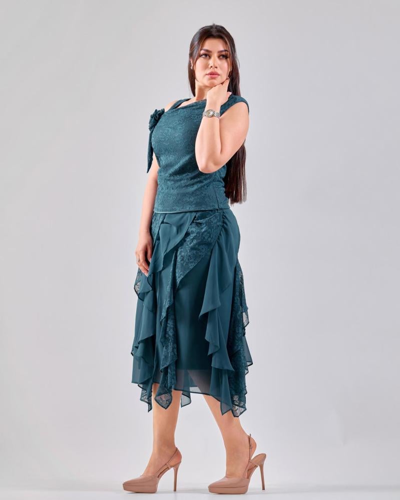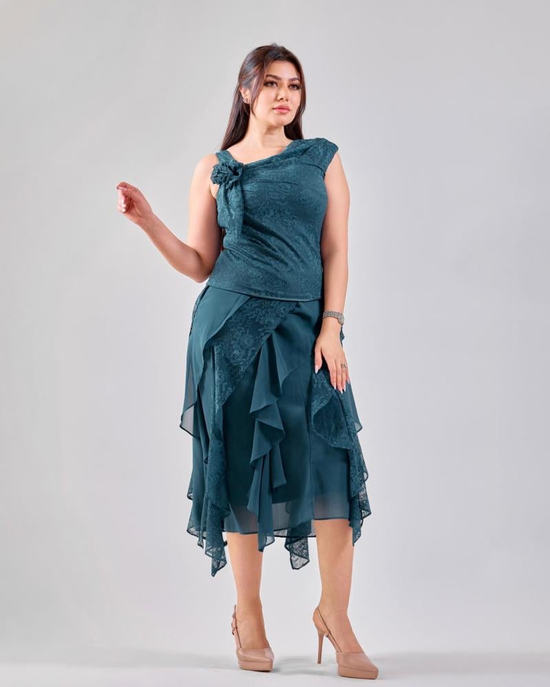 يتميّز هذا الطقم بتصميم بناتي أنيق يعكس ذوقاً ناعماً ومتوازناً، حيث يأتي الجزء العلوي بتفاصيل دانتيل راقية تضيف لمسة أنثوية فخمة، بينما تمنح طبقات الشيفون في التنورة حركة خفيفة وانسيابية جذابة. القَصّة مريحة وتبرز القوام برقي دون تكلّف، ما يجعل الطقم خياراً مثالياً للمناسبات، السهرات الخفيفة.