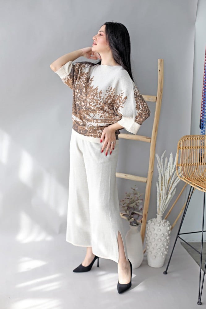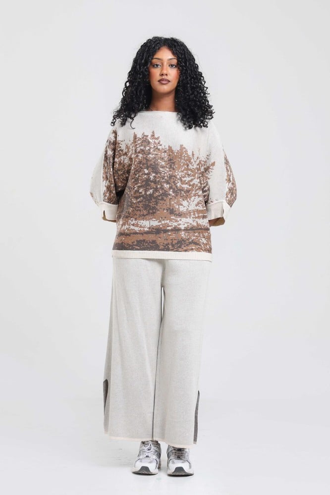 • التصميم: بنطلون واسع مع بلوزة منقوشة