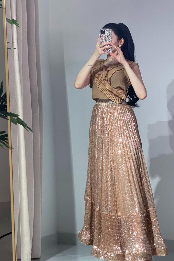 ارتقي بأناقتك في السهرات مع هذا الطقم الراقي الذي يجمع بين الخامة الناعمة والتألق اللافت. البلوزة مصنوعة من شيفون أنيق مزود بتفاصيل كسرات على الصدر والأكمام القصيرة، تمنحك لمسة أنثوية راقية. أما التنورة، فهي من الترتر اللامع بقصة واسعة وانسيابية تضيف حضورًا مبهرًا. التصميم مثالي للمناسبات المسائية وحفلات العشاء، ويعكس توازنًا رائعًا بين الرقي والبريق.