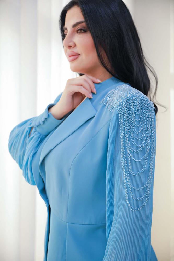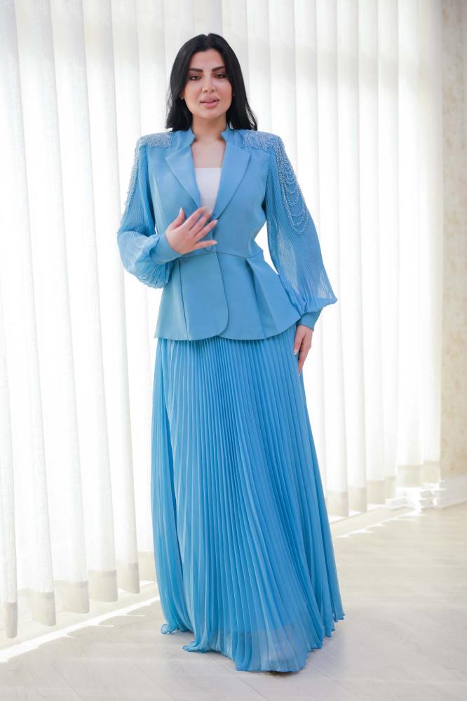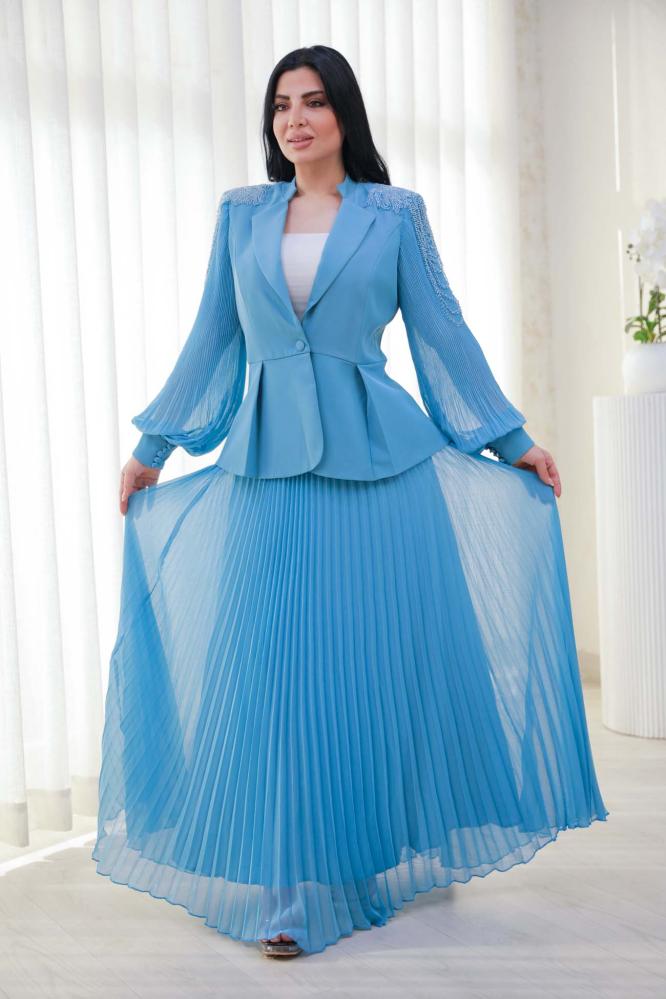 طقم أنيق بلون سماوي يتكوّن من جاكيت بتطريز فاخر على الأكمام وتنورة واسعة بكسرات ناعمة لإطلالة تجمع بين الرقي والنعومة.