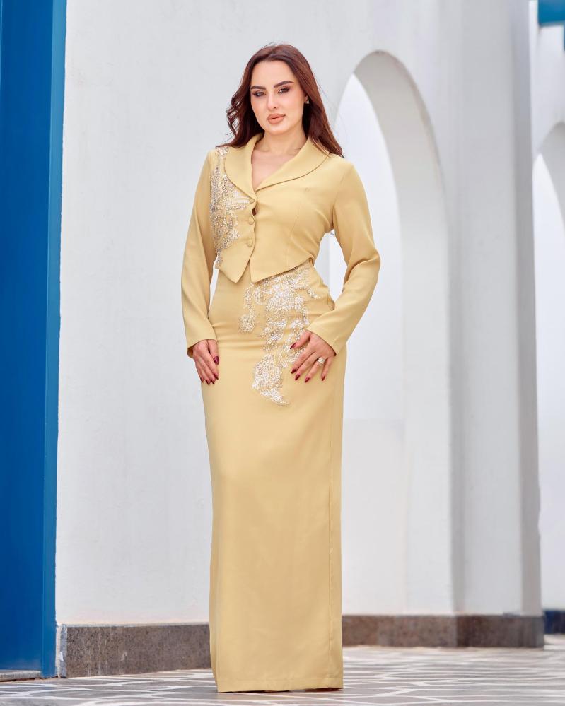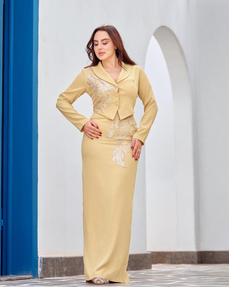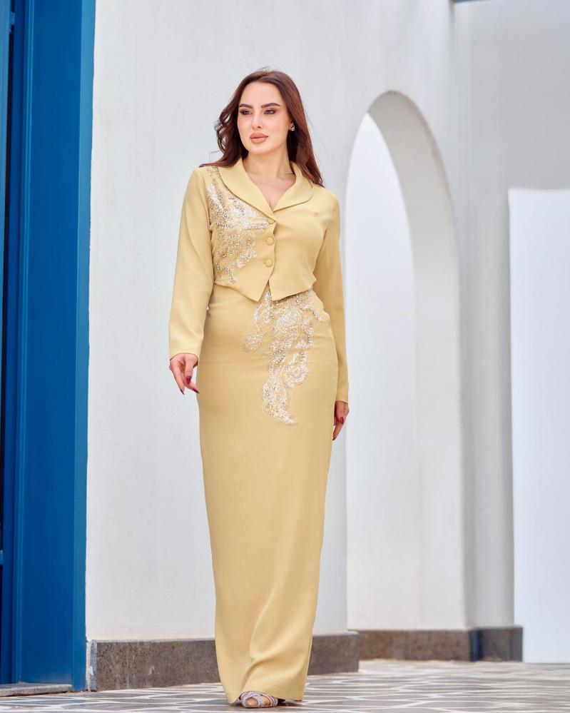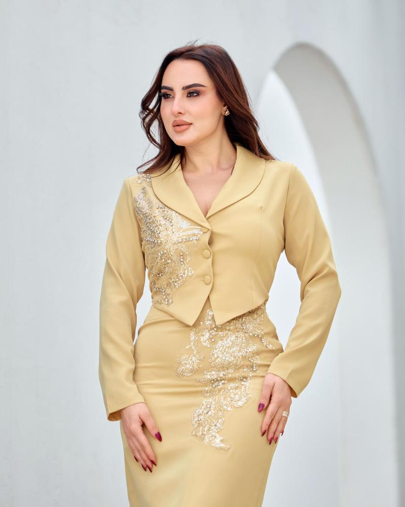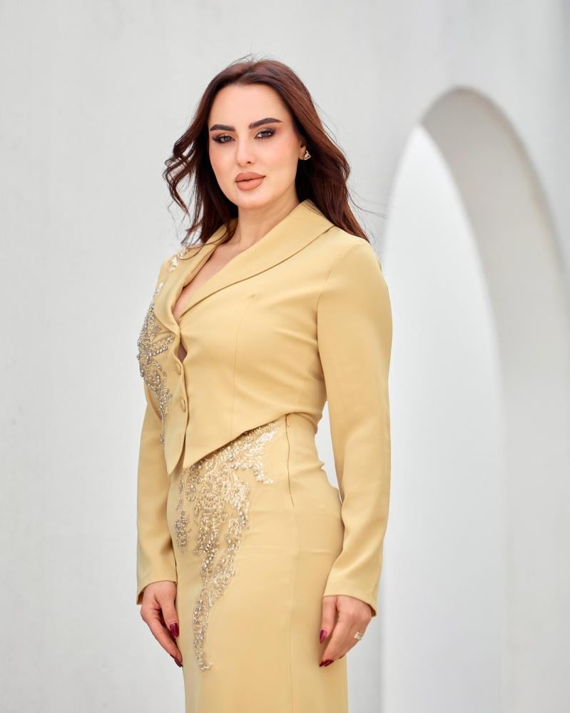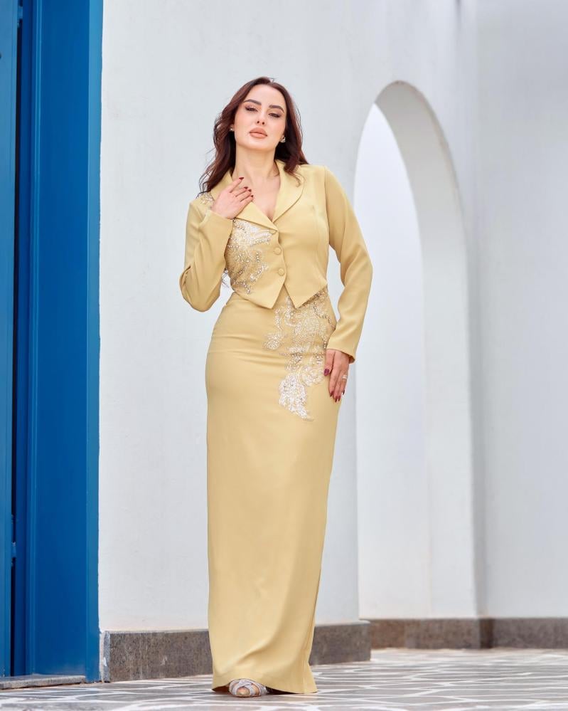 يأتي الفستان بقصة مستوحاة من الجاكيت في الجزء العلوي، مع تطريز شك أنيق يضفي فخامة هادئة ويبرز جمال التصميم دون مبالغة.