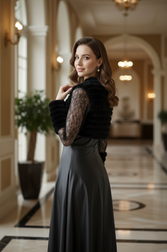 فستان أسود لامع بكرستالات وجاكيت دانتيل وفرو ناعم