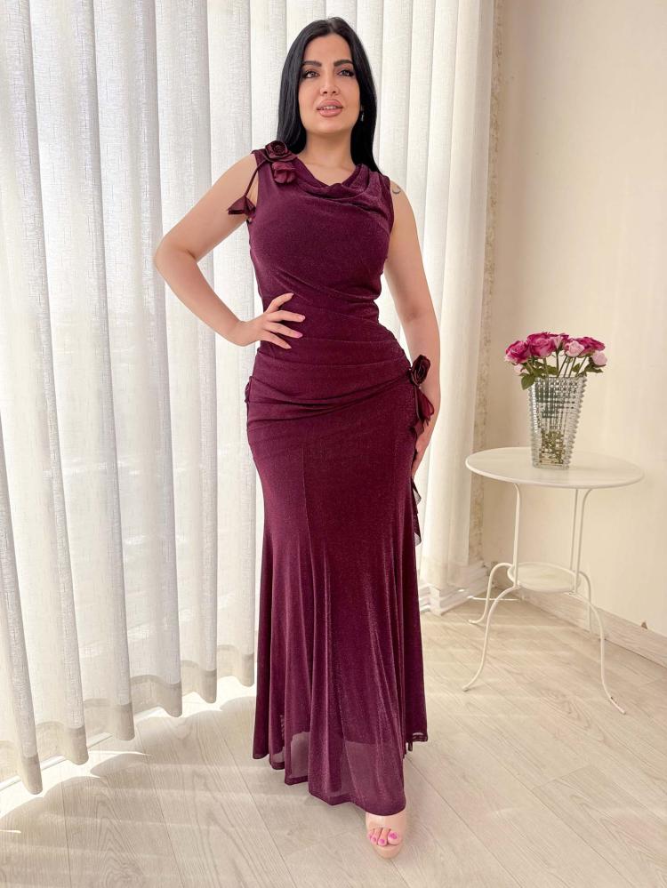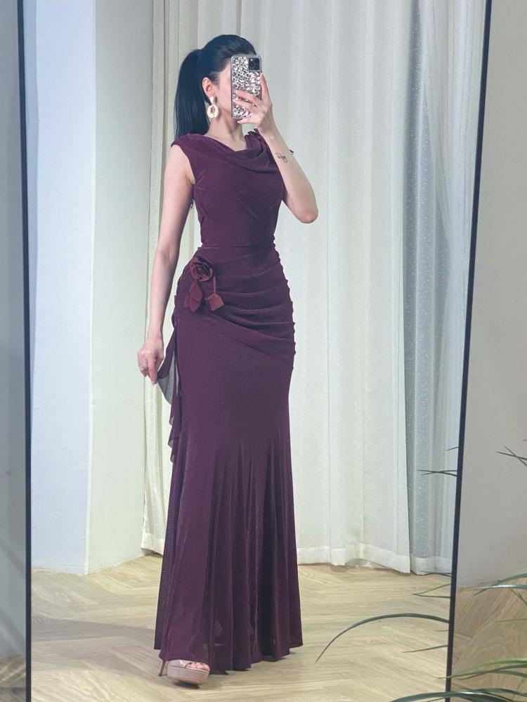 فستان أنثوي ناعم بلون برغندي بقصة ضيقة جذابة، مزين بورود أنيقة على الخصر والكتف لإطلالة راقية في المناسبات الخاصة.