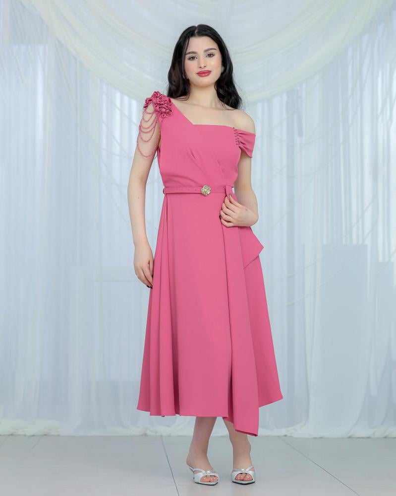 يأتي هذا الفستان بتصميم بناتي راقٍ يجمع بين البساطة والفخامة، مصنوع من خامة الكريب التي تنسدل بانسيابية ناعمة وتوفر مظهراً أنيقاً ومريحاً. تصميم الكتف الواحد يضفي لمسة عصرية جذابة، بينما يزين الإكسسوار الأنيق عند الكتف ليمنح الفستان طابعاً أنثوياً مميزاً. القَصّة المتوازنة مع الحزام الناعم تبرز القوام برقي، ليكون خياراً مثالياً للحفلات والمناسبات الراقية.