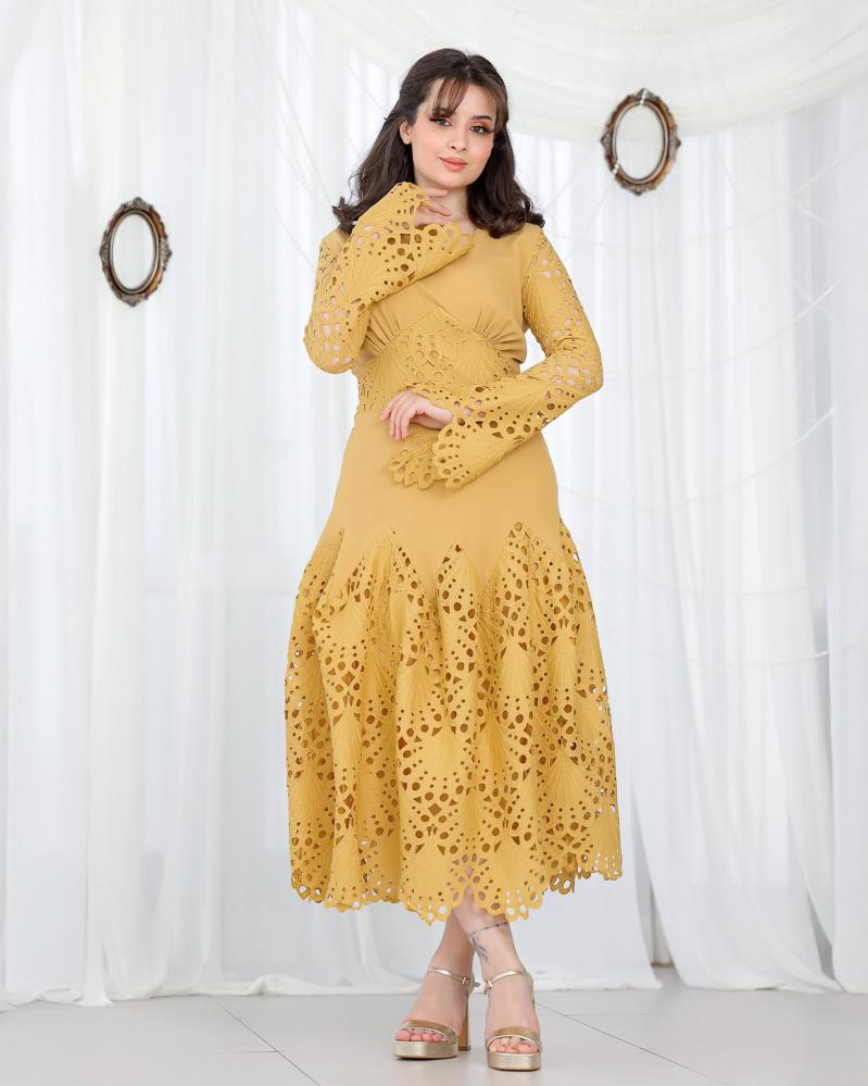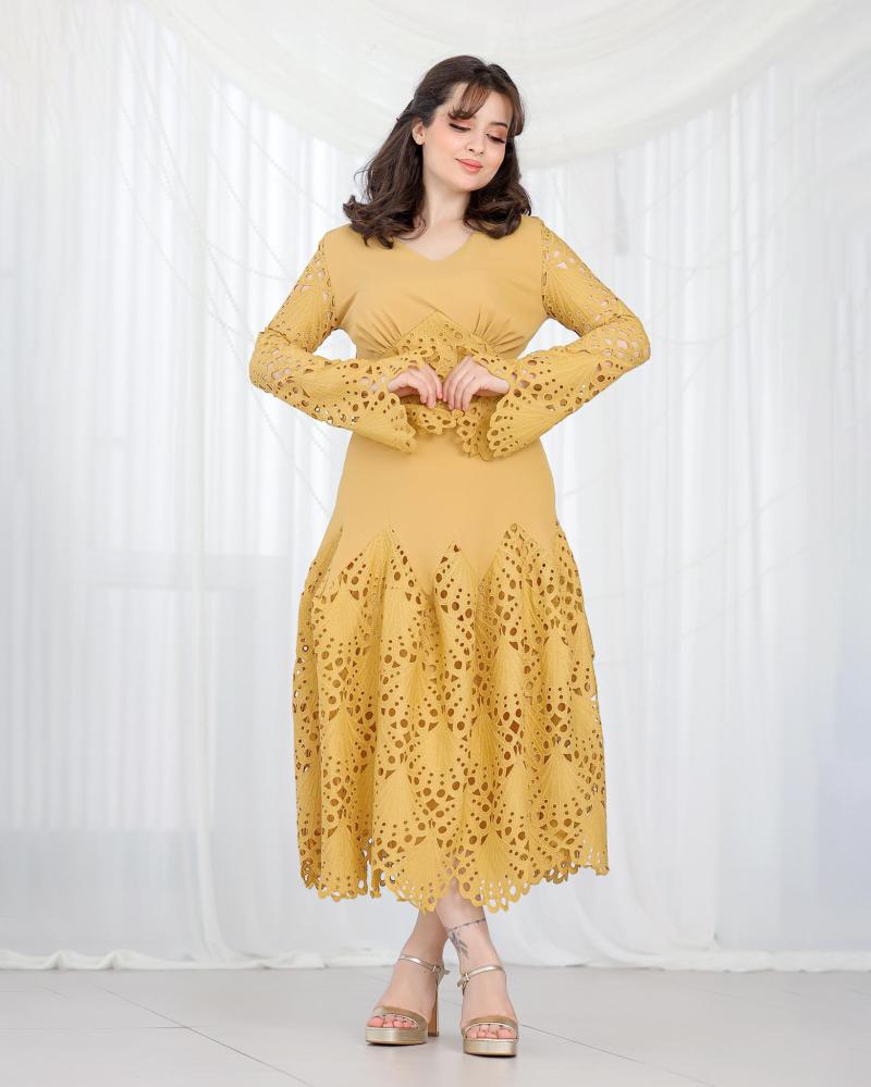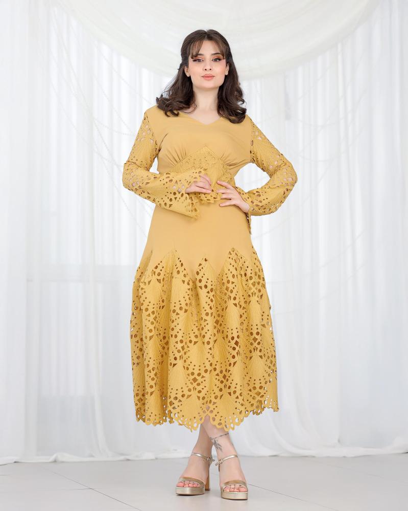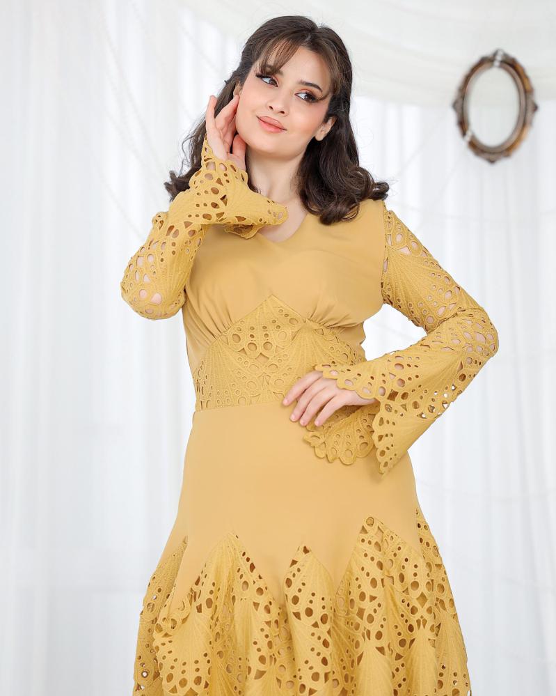 يأتي الفستان بياقة V ناعمة توازن الإطلالة، مع أكمام طويلة من الجوبير تضيف احتشامًا راقيًا، وقصة متدرجة في الأسفل تعزز الحركة وتبرز جمال القوام بأسلوب أنيق.