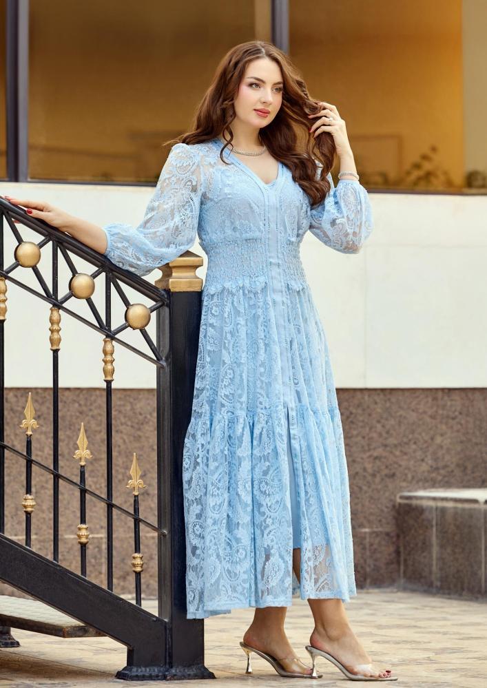التصميم يأتي بقصّة أنيقة تبرز القوام بأسلوب متوازن، مع خامة دانتيل تمنح الإطلالة نعومة ورقيًا واضحًا.