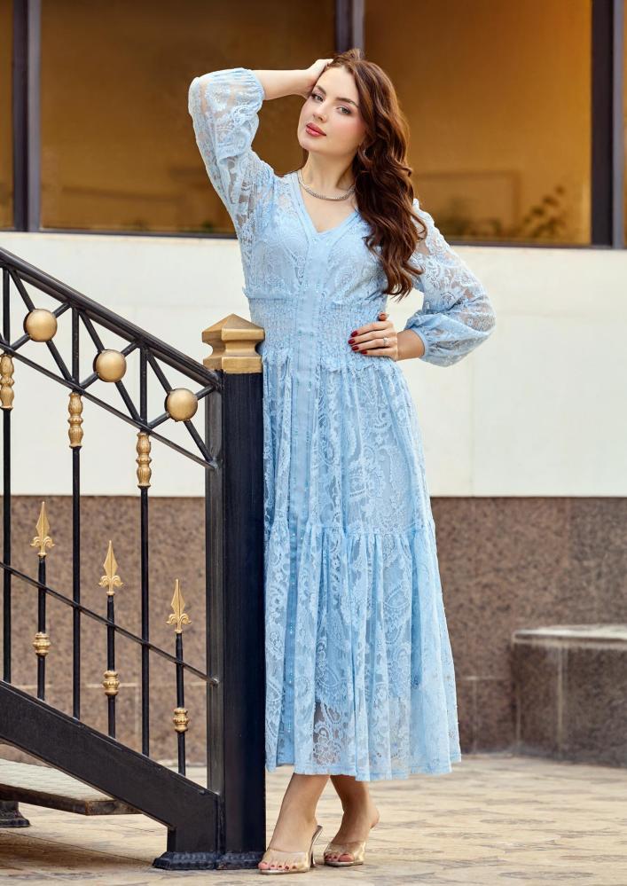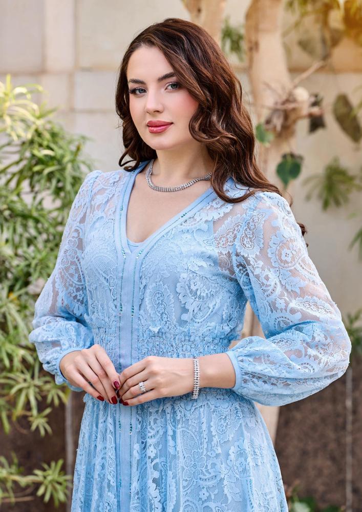 فستان أنثوي راقٍ مصنوع من خامة الدانتيل الفاخرة، يتميّز بتفاصيل كريستال استرتش تضيف لمسة فخامة ناعمة دون مبالغة.