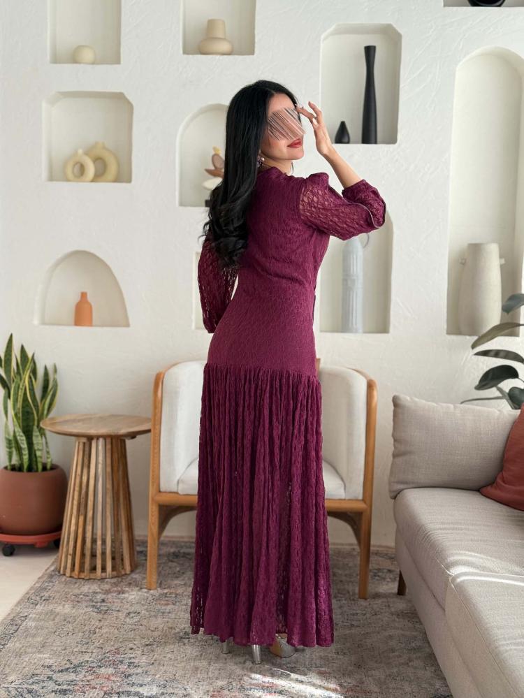 فستان دانتيل طويل بأكمام شفافة بلون عنابي