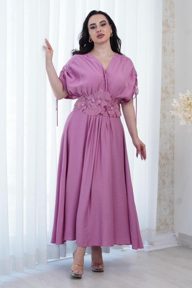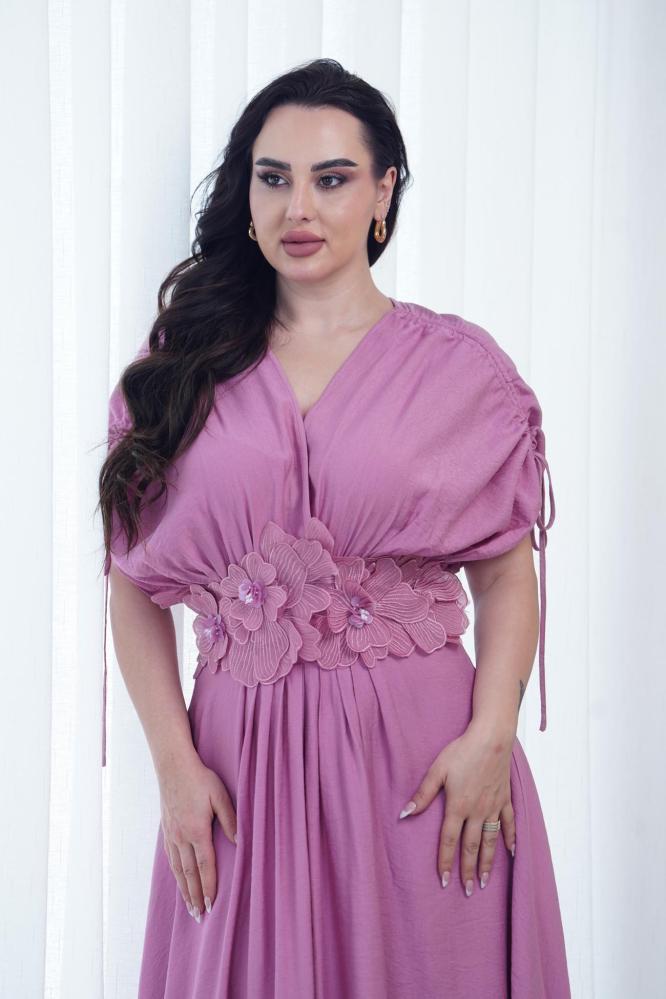 فستان ناعم زهري مزين بورود ثلاثية الأبعاد على الخصر