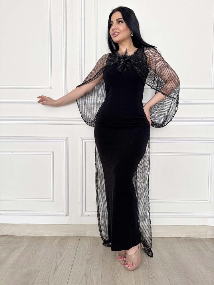 فستان أسود بلمعة جذابة وشال شفاف لإطلالة مسائية أنيقة.