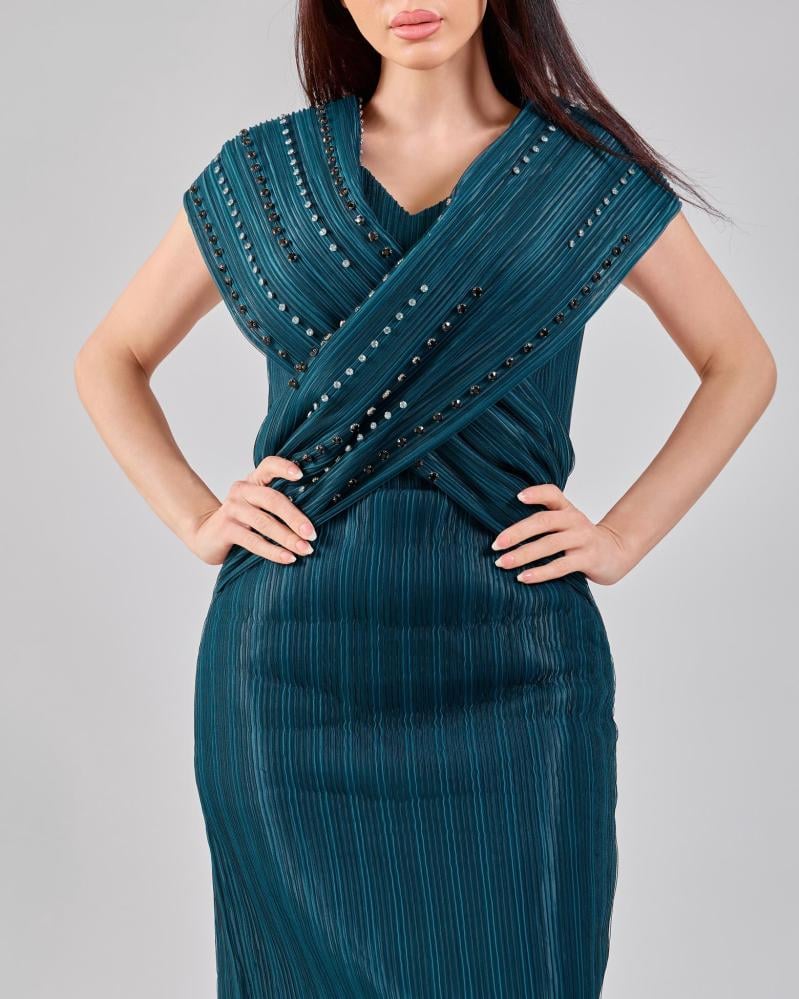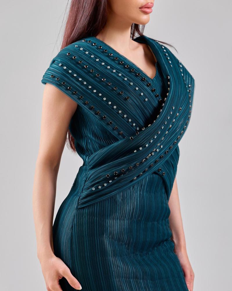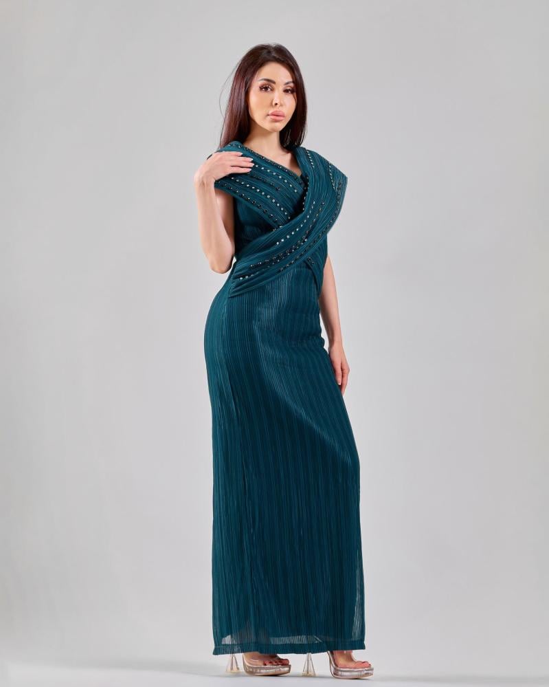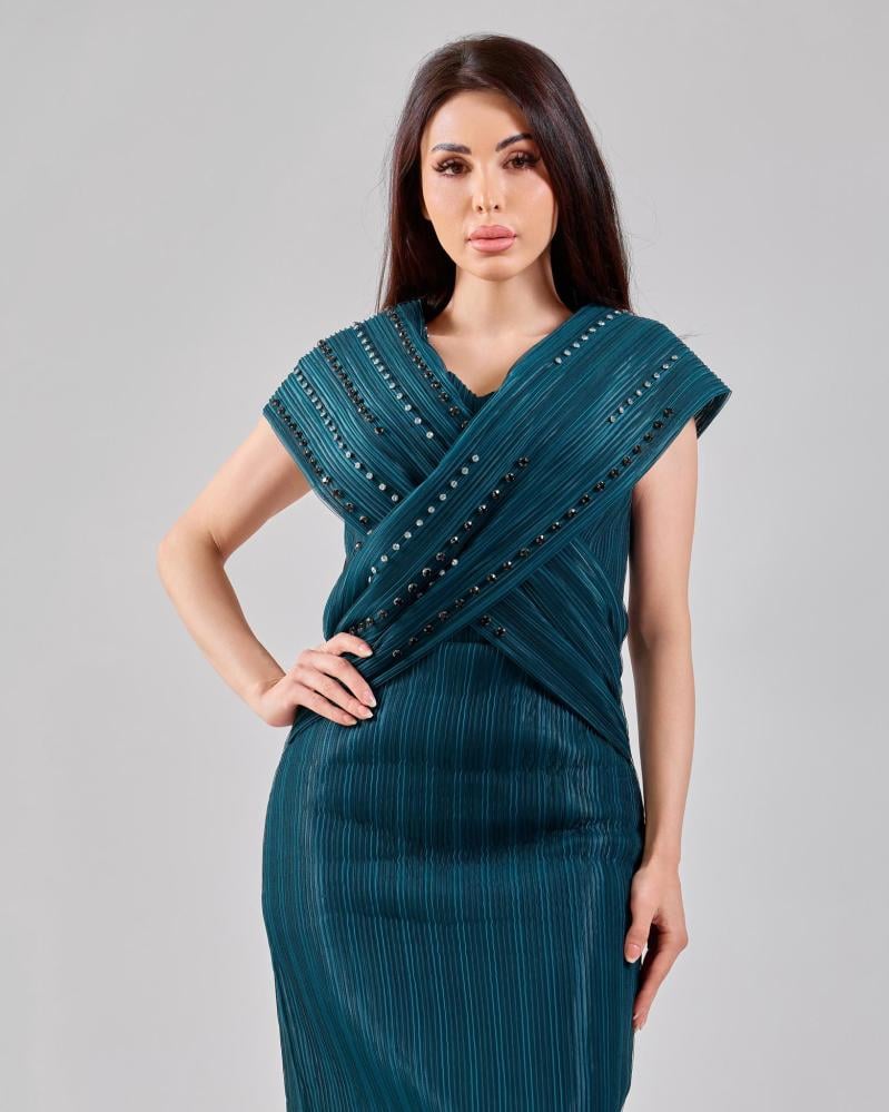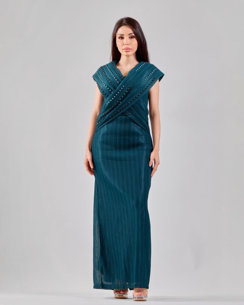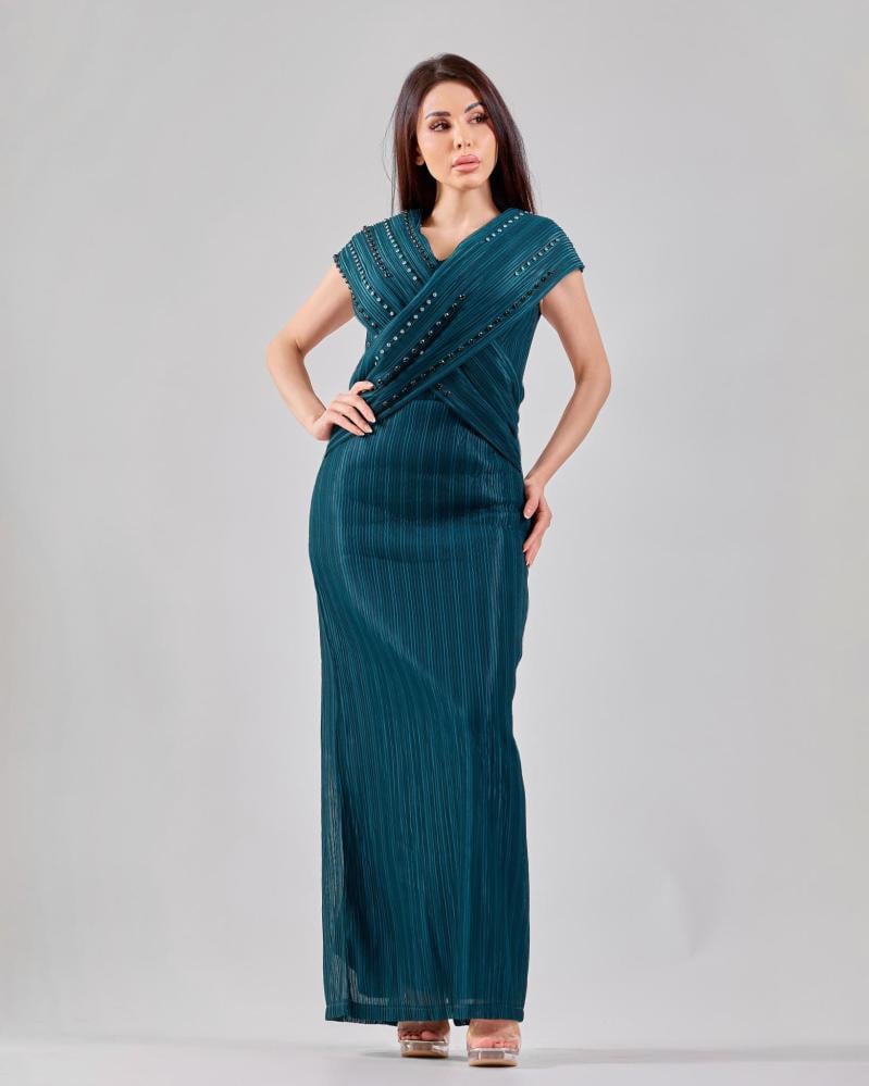 يأتي هذا الفستان بتصميم راقٍ يجمع بين الأناقة الكلاسيكية واللمسة العصرية، حيث تمنح القَصّة المكسرّة مظهراً أنثوياً انسيابياً يبرز القوام برقي. تفاصيل الكريستال الموزعة بعناية تضيف بريقاً ناعماً دون مبالغة، لتمنحك إطلالة فاخرة ومتوازنة. تصميم الفستان الطويل بقصة اللف يضفي حضوراً أنيقاً يجعله خياراً مثالياً للسهرات والمناسبات الرسمية.