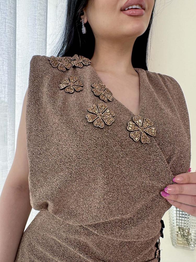 فستان سهرة ناعم قماش لمعة استرتش لون موكا موس مزين بورود بالخصر والكتف