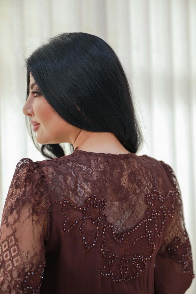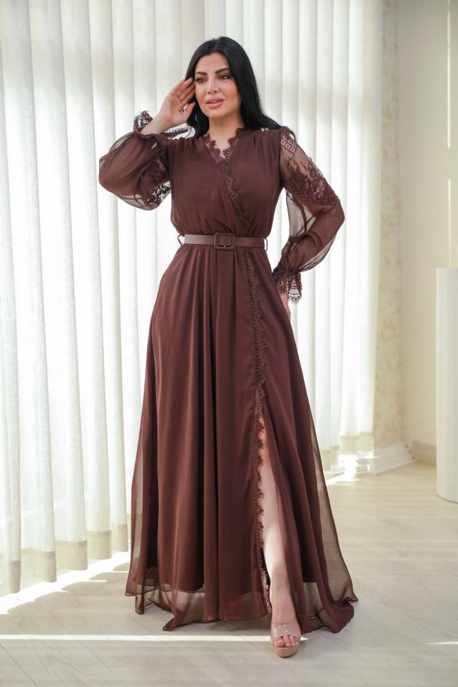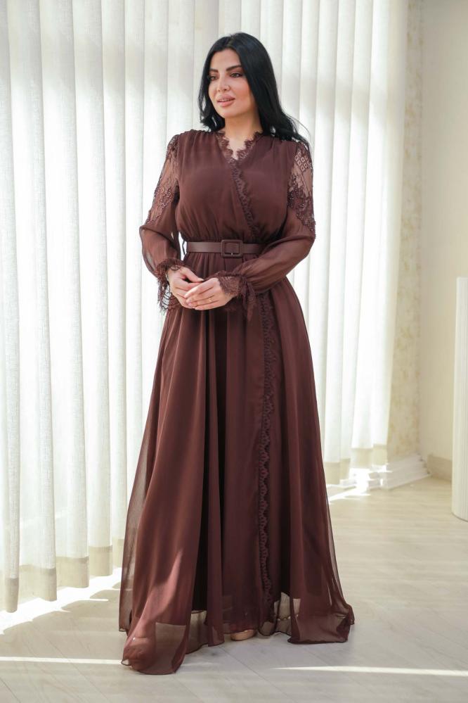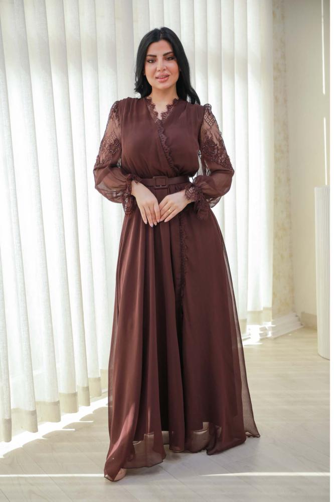 فستان شيفون بلون بني غامق بتصميم طويل ومحتشم، مزين بأكمام دانتيل فاخرة وحزام على الخصر لإطلالة أنثوية راقية.
