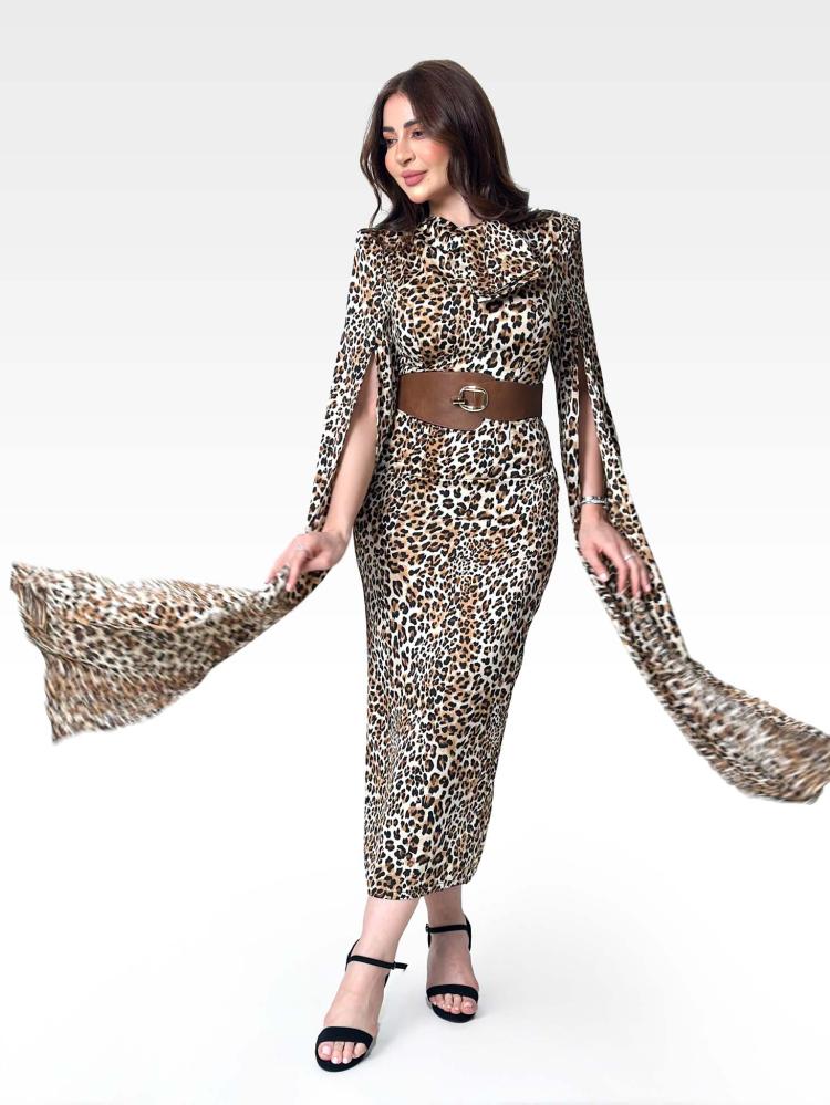 فستان سهرة بنقشة التايجر يجمع بين الأناقة والجرأة، مصمم بأكمام طويلة وواسعة ليمنحك إطلالة فريدة وأنيقة، مع حزام عند الخصر يبرز جمال القوام.
