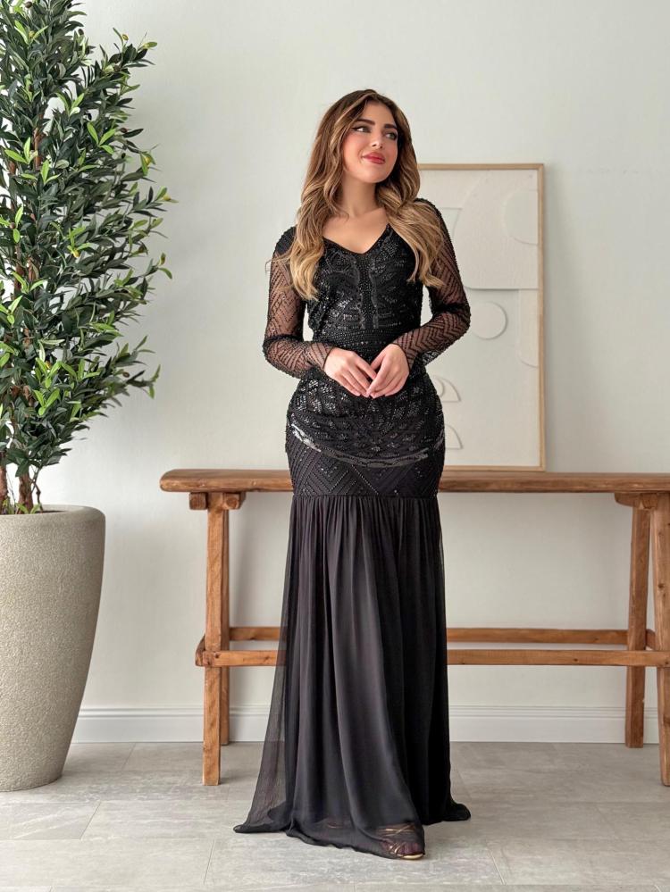 فستان سهرة أسود طويل بتطريز لامع وتصميم فاخر