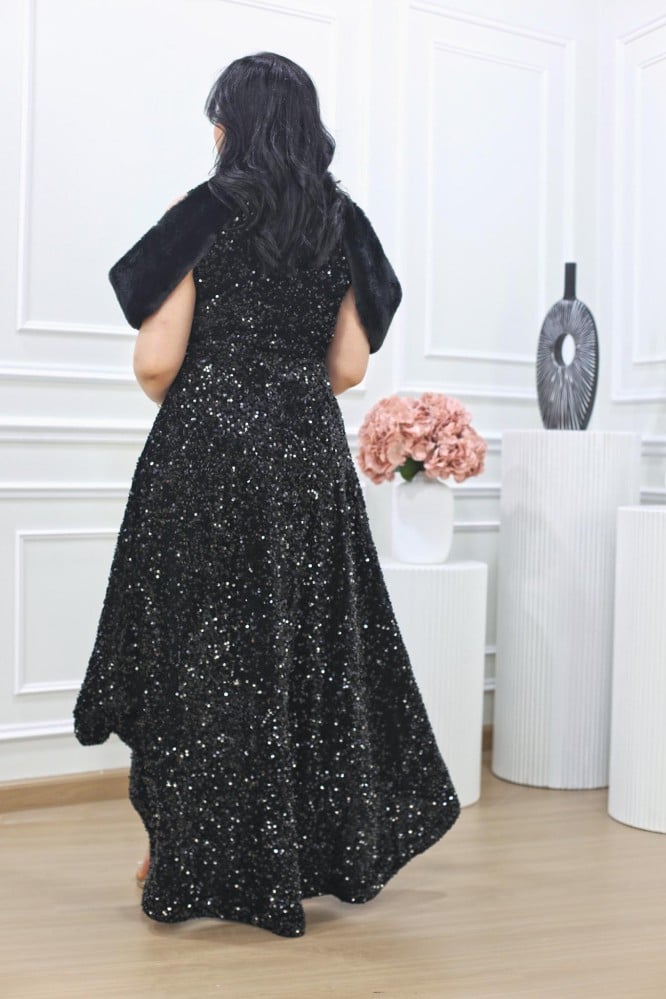 تألقي بإطلالة فاخرة مع فستان السهرة الأسود المصمم بترتر لامع يمنحك لمسة من التألق والجاذبية. يتميز بشال فرو فاخر يضفي لمسة من الأناقة والفخامة، مع قصة مميزة تضفي سحرًا خاصًا على إطلالتك. تصميم مثالي للسهرات والمناسبات الفاخرة، يجمع بين الأنوثة والرقي ليمنحك حضورًا استثنائيًا. احصلي عليه الآن!
