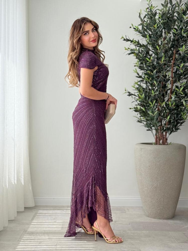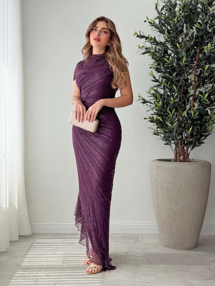 ارتقي بإطلالتك مع هذا الفستان الفاخر المصمم من قماش الترتر اللامع بلون موف جذّاب. يتميز بتصميم ضيق يبرز جمال القوام، مع ياقة مرتفعة وأكمام قصيرة تمنحه طابعًا راقيًا ومختلفًا. يمتد الفستان بطول أنيق مع شق جانبي يضفي لمسة أنثوية ساحرة. مثالي للمناسبات الكبيرة كالأعراس وحفلات المساء، ويمنحك حضورًا لافتًا لا يُنسى.