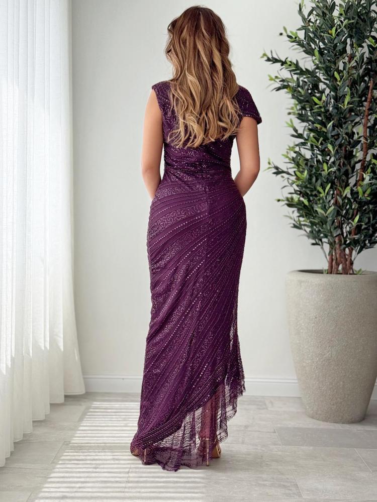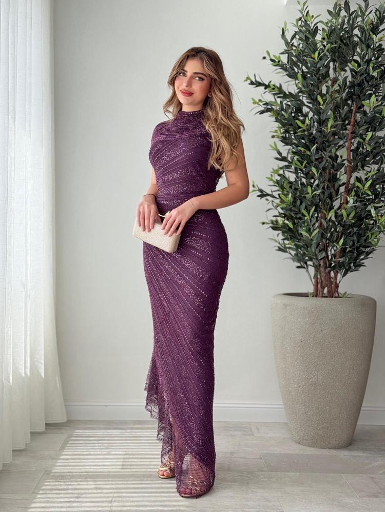 فستان سهرة أنيق بلون موف ملكي، مطرّز بالكامل بالترتر المتلألئ، بتصميم ناعم يبرز أنوثتك بكل فخامة.