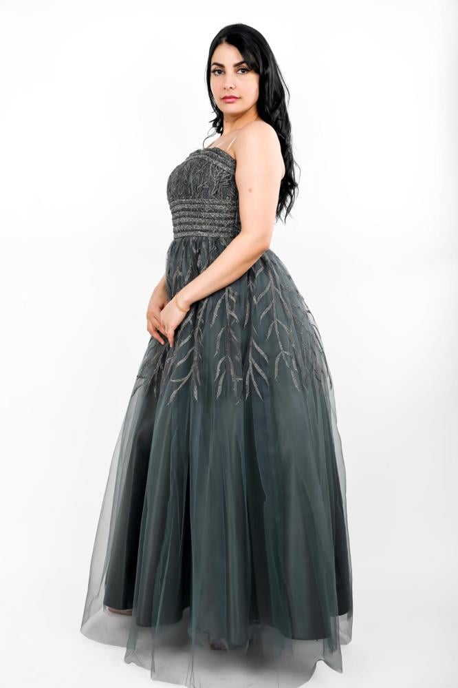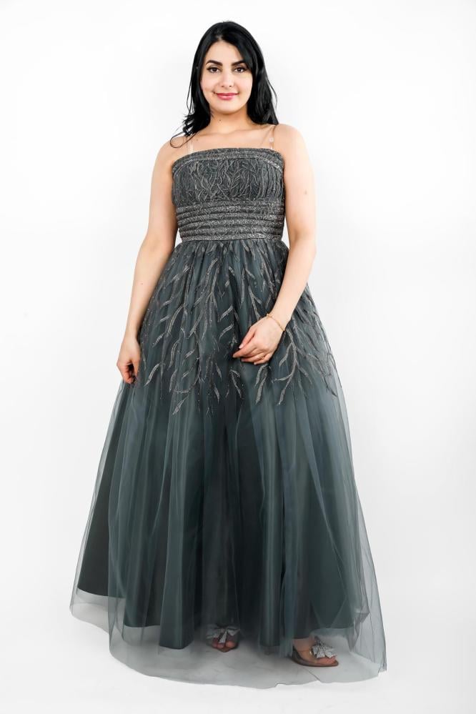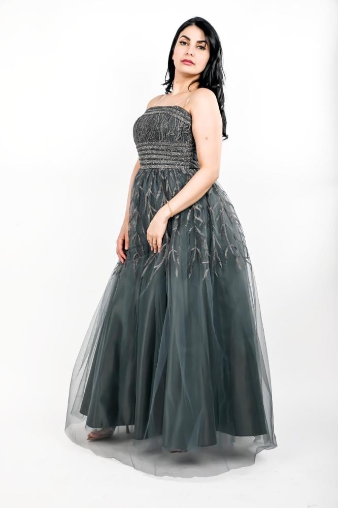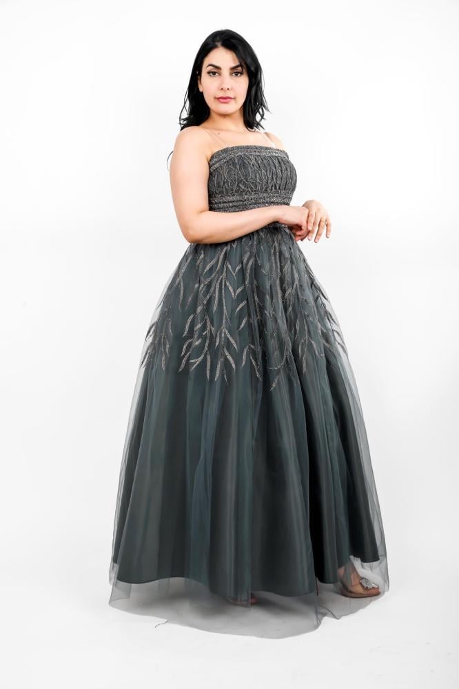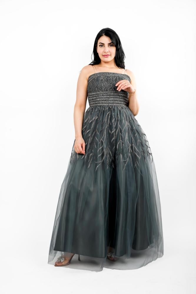 استعدي لتألق لا يضاهى مع هذا الفستان الفخم المصنوع من قماش التل المطرز، الذي يجمع بين الأناقة والرقي. يتميز الفستان بتصميمه العصري والبسيط الذي يبرز جمال القوام ويضفي لمسة من الفخامة على إطلالتك. يتميز الفستان بأكتاف مكشوفة وخصر مشدود ليبرز جمال القوام، بينما تتدلى التنورة بشكل انسيابي ليضفي لمسة من الرومانسية والجمال.