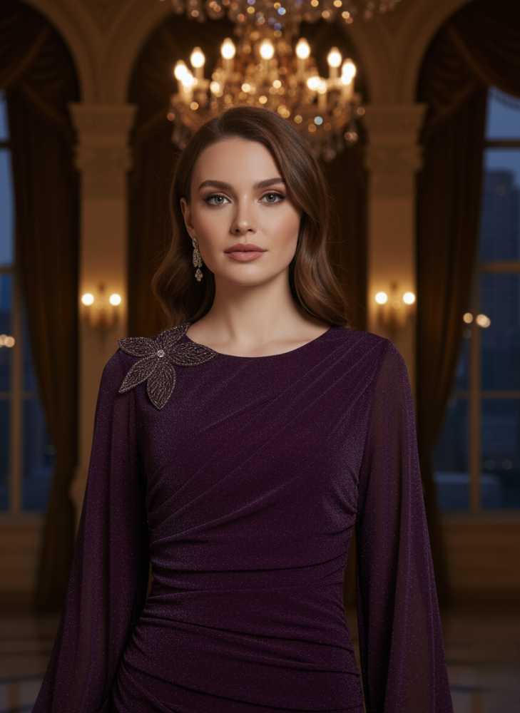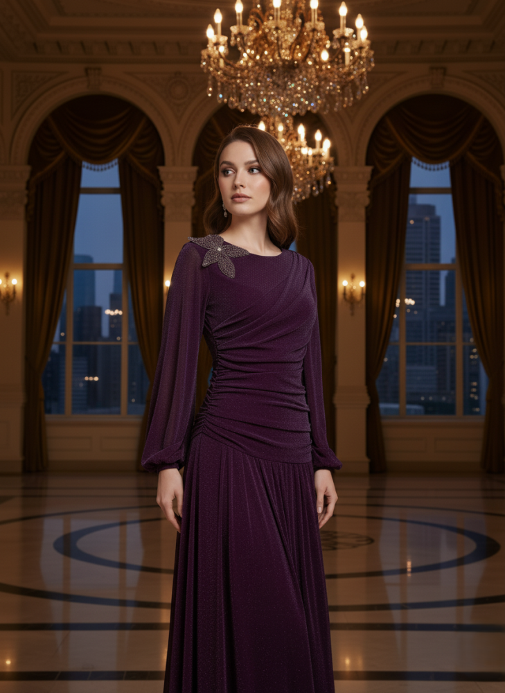 فستان سهرة فاخر من خامة الجورسيه اللامعة باللون البرغندي، يتميز بدربيات أنيقة من الأمام وتكسيرات خلفية ناعمة، مزين بإكسسوار كريستال فاخر يمنح إطلالة راقية وجذابة.