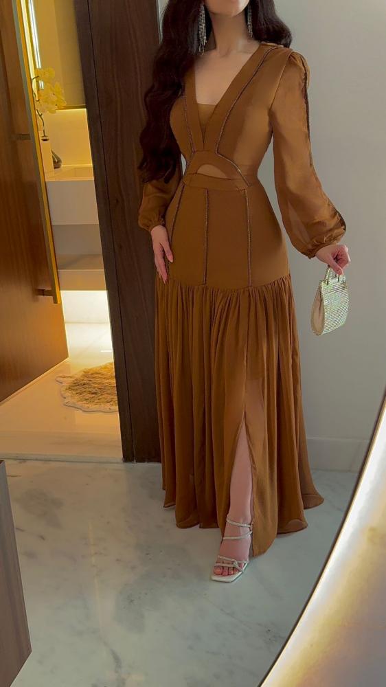 تألقي بإطلالة فخمة مع هذا الفستان الشيفون الطويل، المزين بتفاصيل كريستال لامعة تضيف بريقًا وأناقة لا تُقاوم. الفستان مصمم بعناية ليبرز جمال القوام بفضل الكورسيه المحكم والأكمام الطويلة، مع لمسات من الكريستال اللامع التي تعكس الضوء بشكل جذاب. يأتي الفستان بتجميعات جانبية تضفي حركة وتألقًا عند كل خطوة، مما يجعله مثاليًا للحفلات والمناسبات الليلية. سواء كنتِ تحضرين حفل زفاف أو عشاءً رومانسيًا، فإن هذا الفستان سيضمن لكِ أن تكوني نجمة الحفلة